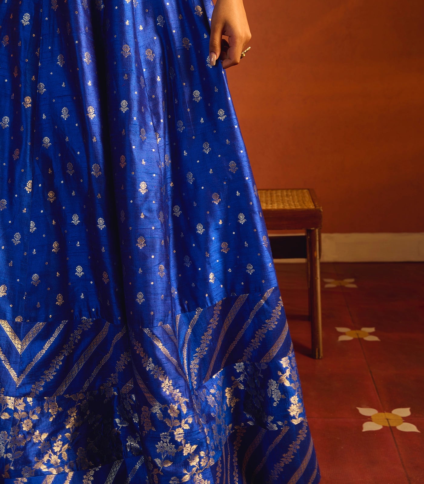 A tapestry of tradition and artistry, this royal blue pure raw silk Banarasi lehenga showcases fine weaving and intricate craftsmanship. The 12-panelled skirt features gold zari butta motifs, flowing into three ornate borders of diagonal stripes and floral jaal patterns that add rhythm and grandeur. Paired with a hand-embroidered blouse, adorned with silver and gold zardozi, sequins, and beads on the shoulder, neckline, and waist, and finished with a sculpted V-cut hemline for definition. The look is completed with a silver tissue dupatta, adding a graceful, luminous touch. A portrait of regal elegance. Woven in silk, detailed by hand, and made to be remembered. Blouse and Skirt Fabric: Pure Banarasi Raw silk fabric Dupatta : Silver tissue organza Wash care : Dry clean only.