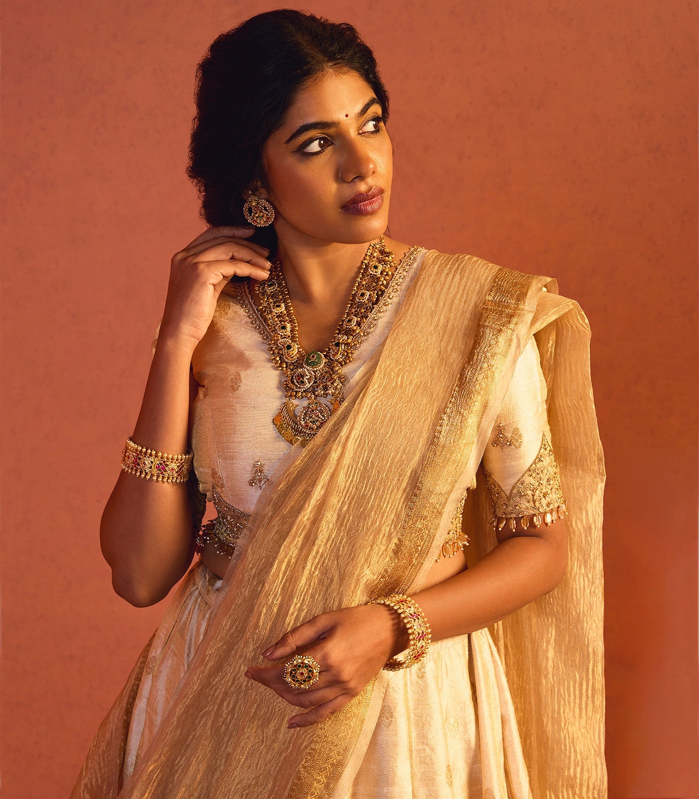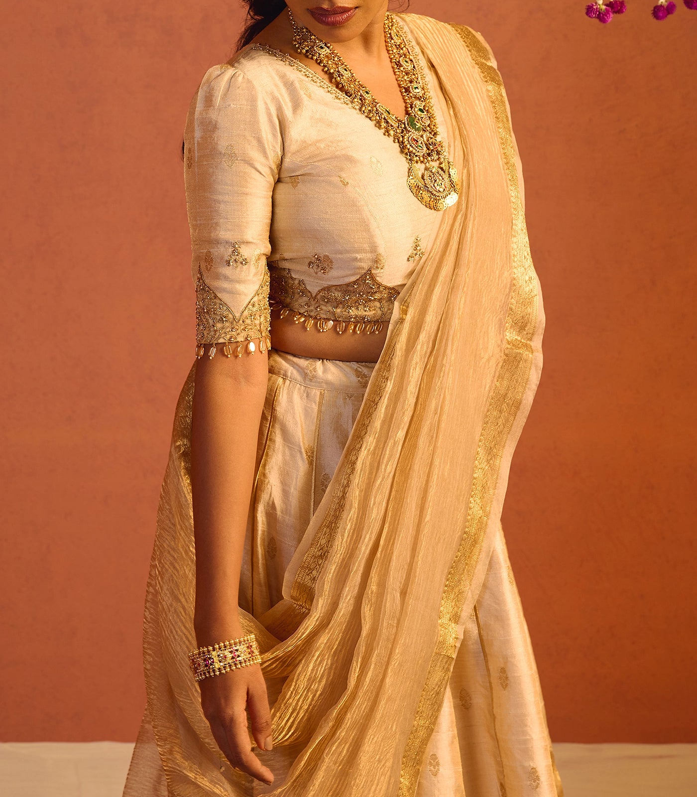 The ensemble is paired with a crushed gold tissue dupatta, finished with a gold border. Light, lustrous, and layered in elegance