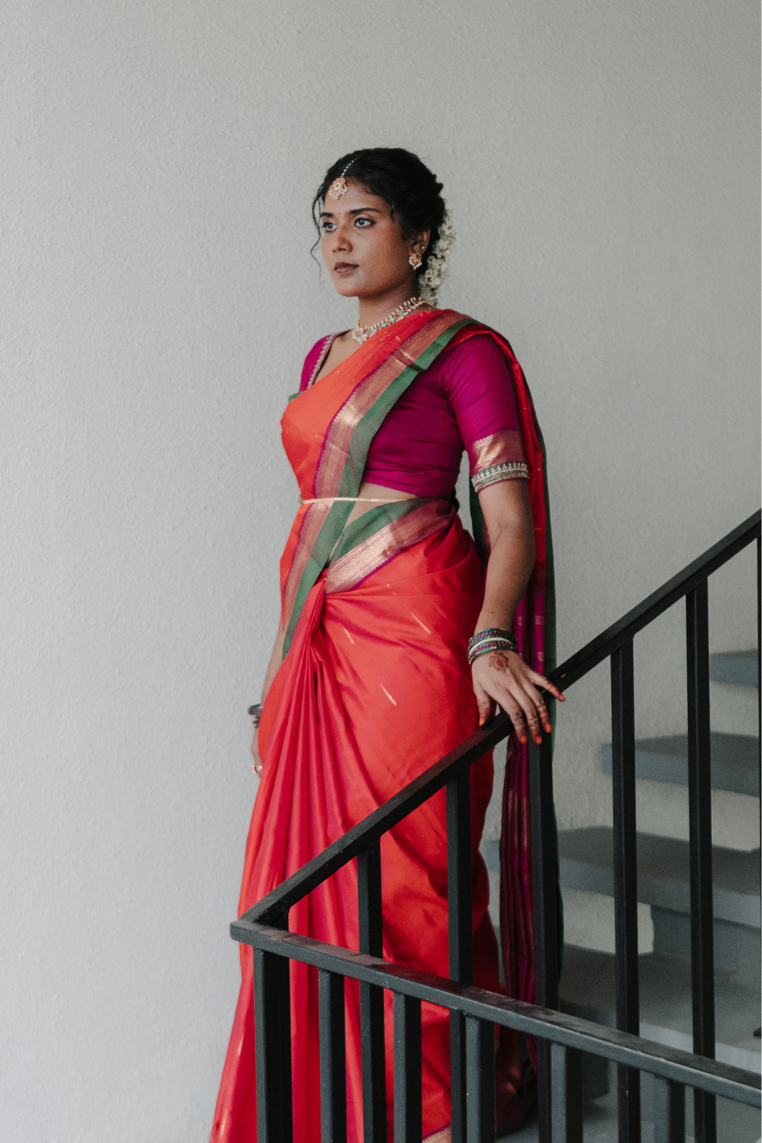 Shabna wore a simple yet stunning orange-pink double shaded handloom silk saree with rain drop motifs, for her muhurtham, a graceful nod to the Tamil bridal look she had envisioned: graceful, traditional and vintage. They exchanged vows, rings, metti, and a thali chain while standing on rose petals, surrounded by white tuberoses and hanging roses.