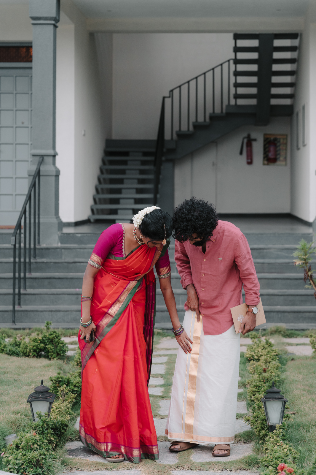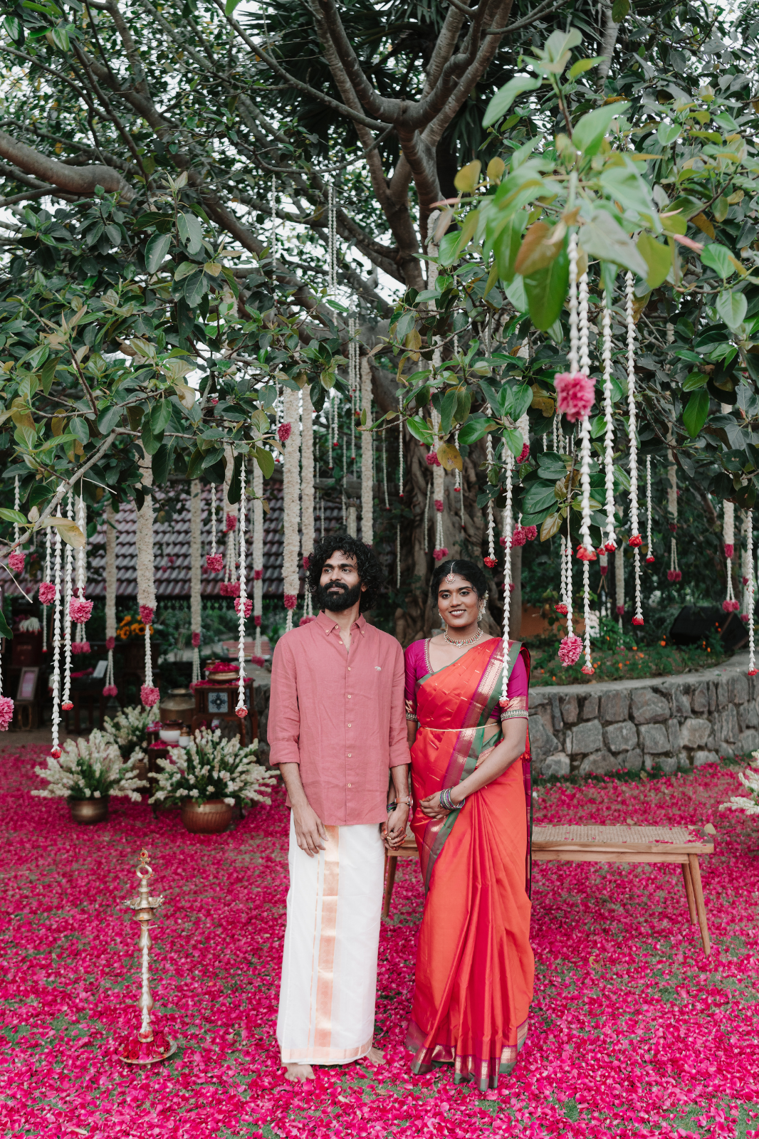 Their wedding, Inaiyerpu Vizha (Inai meaning “equal,” Yerpu meaning “acceptance,” and Vizha meaning “celebration”), reflected their shared values. Held on the open lawn of Hibis Sparsa as the morning sun rose behind the mountains, it was an intimate, priest free ceremony with no raised stage or rituals that didn’t resonate with them. Instead, petals formed a natural boundary under a tree, allowing guests to gather freely.