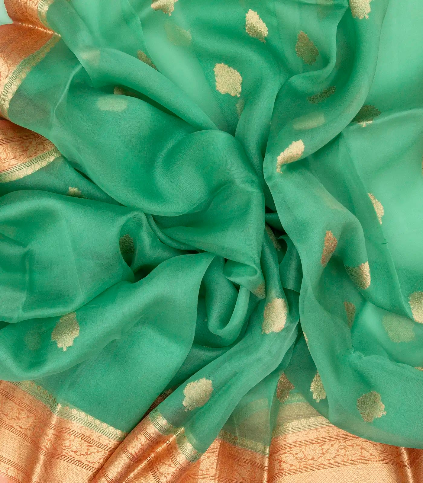 This handwoven banarasi organza silk saree is filled with floral zari buttas in aquamarine body along with contrast zari border and pallu