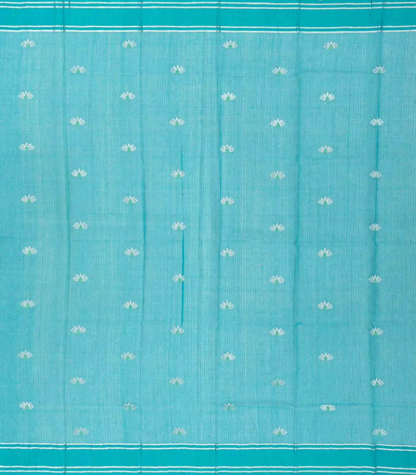 This handwoven kota silk saree is filled with meena floral buttas in aquamarine body along with contrast border and pallu