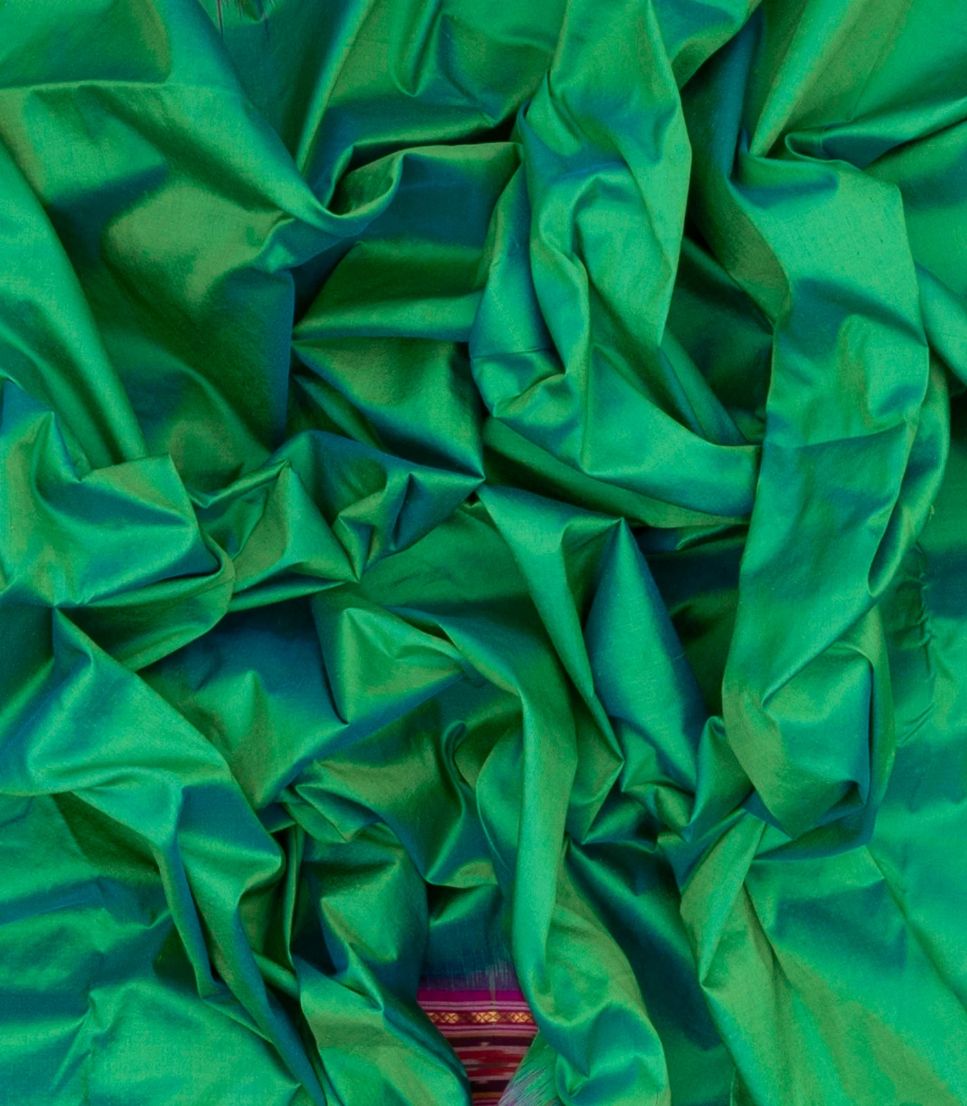 This handwoven pochampally ikat silk saree is filled with plain aquamarine body along with tie & dye floral motifs in contrast pink border and pallu
