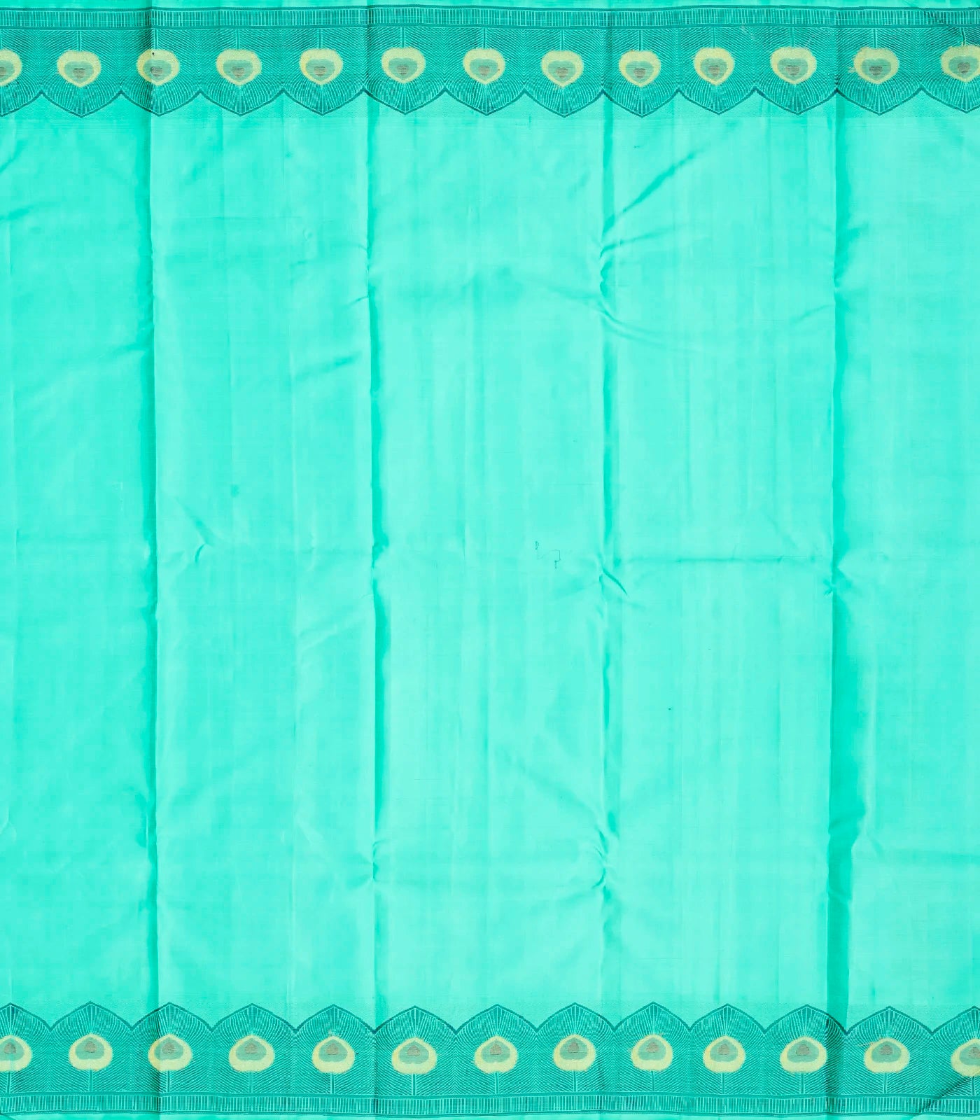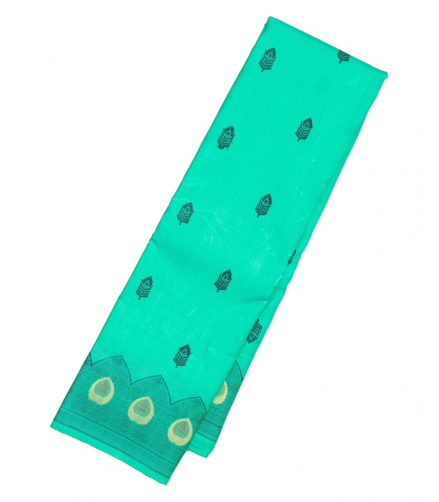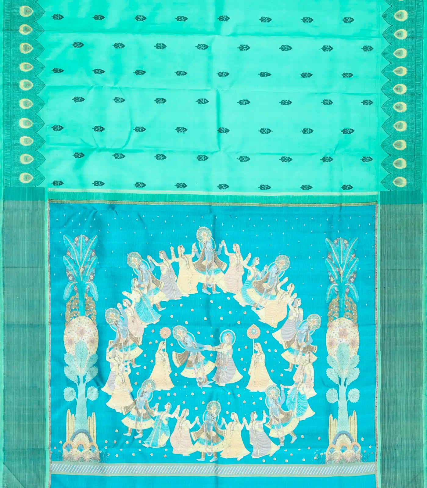 The vibrant aqua green body flows seamlessly from the pallu, radiating elegance and poise. The border showcases peacock feathers in shimmering zari and rich meena work, together in intricate patterns that evoke the grace and mysticism of Lord Krishna’s cherished symbol.