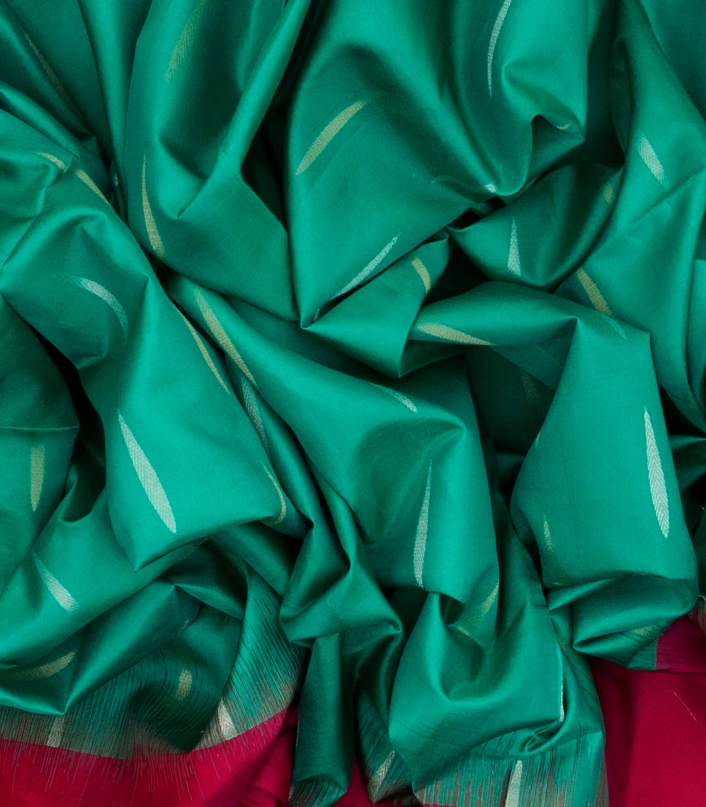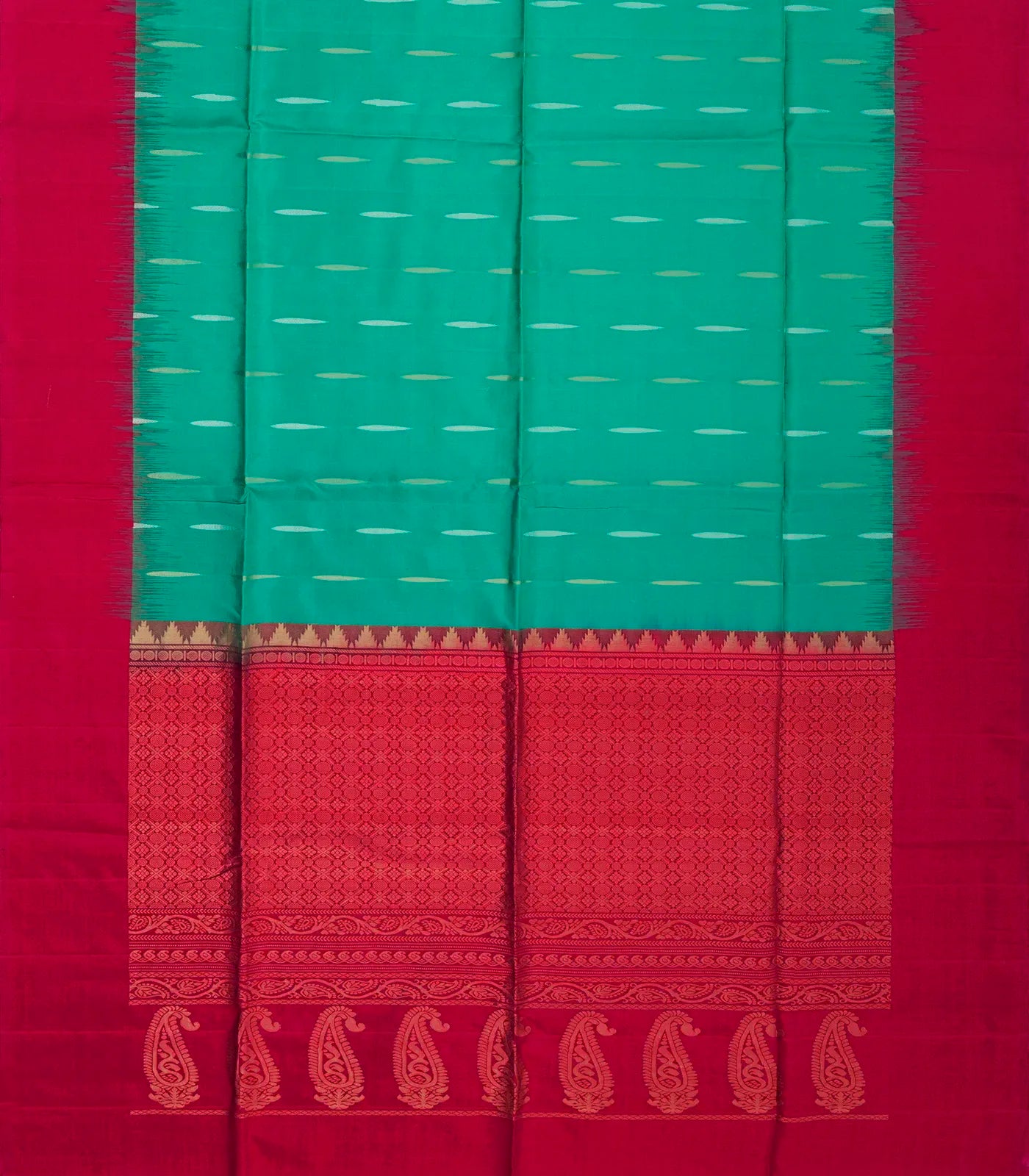 This handwoven soft silk saree is filled with droplet motifs in aquamarine body along with contrast border and pallu