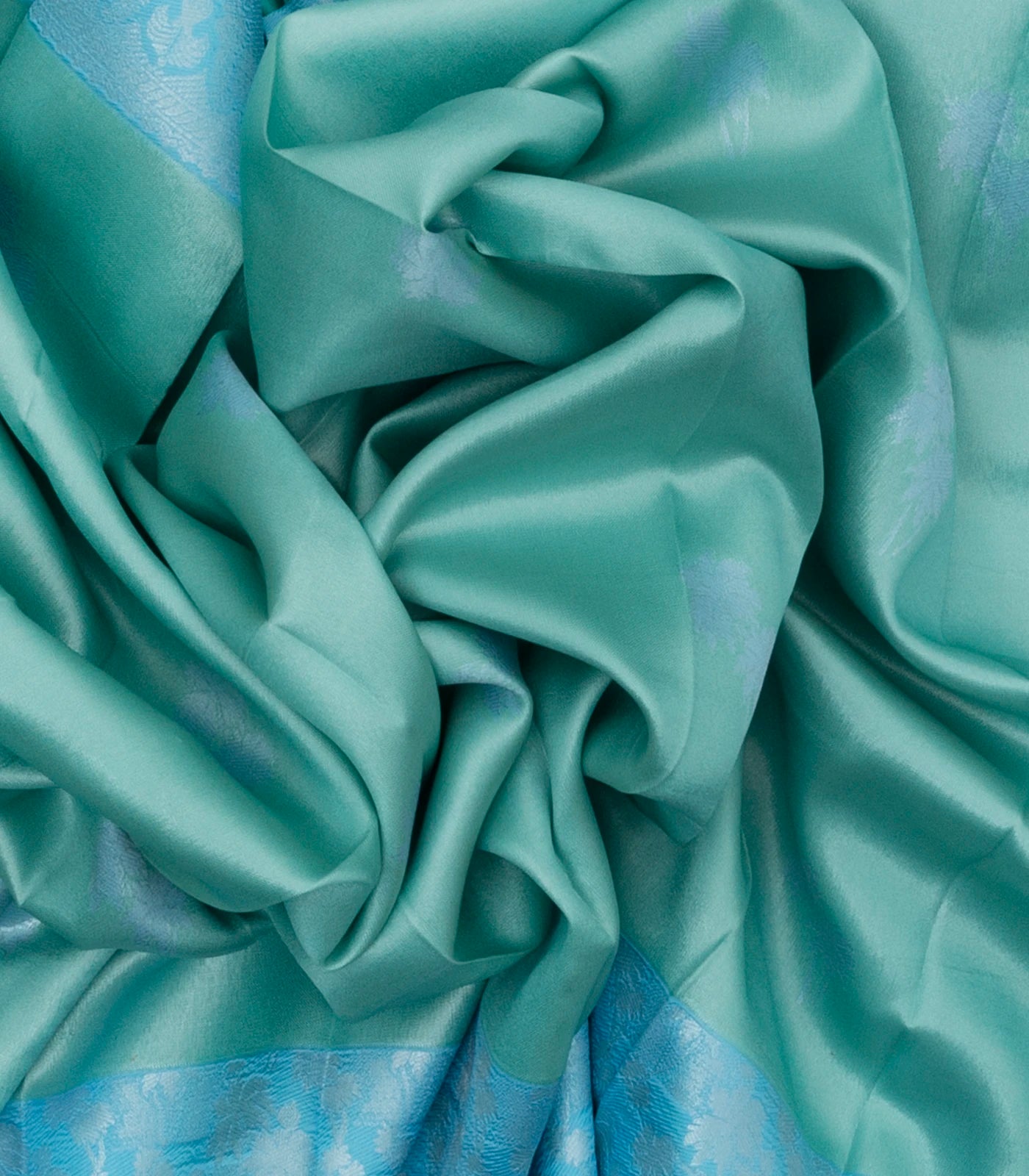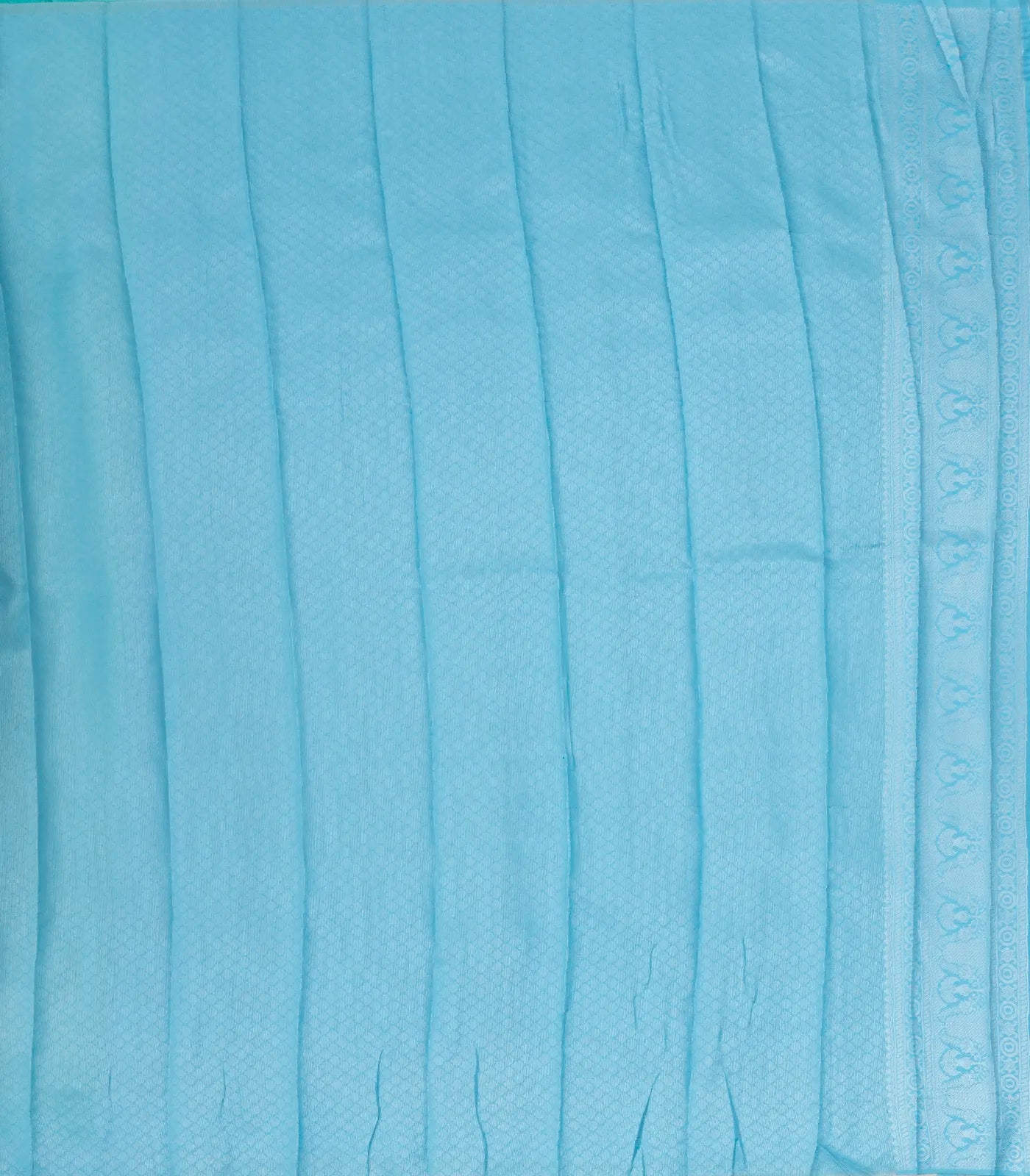This woven art tissue saree is filled with floral motifs in aquamarine body along with contrast border and pallu