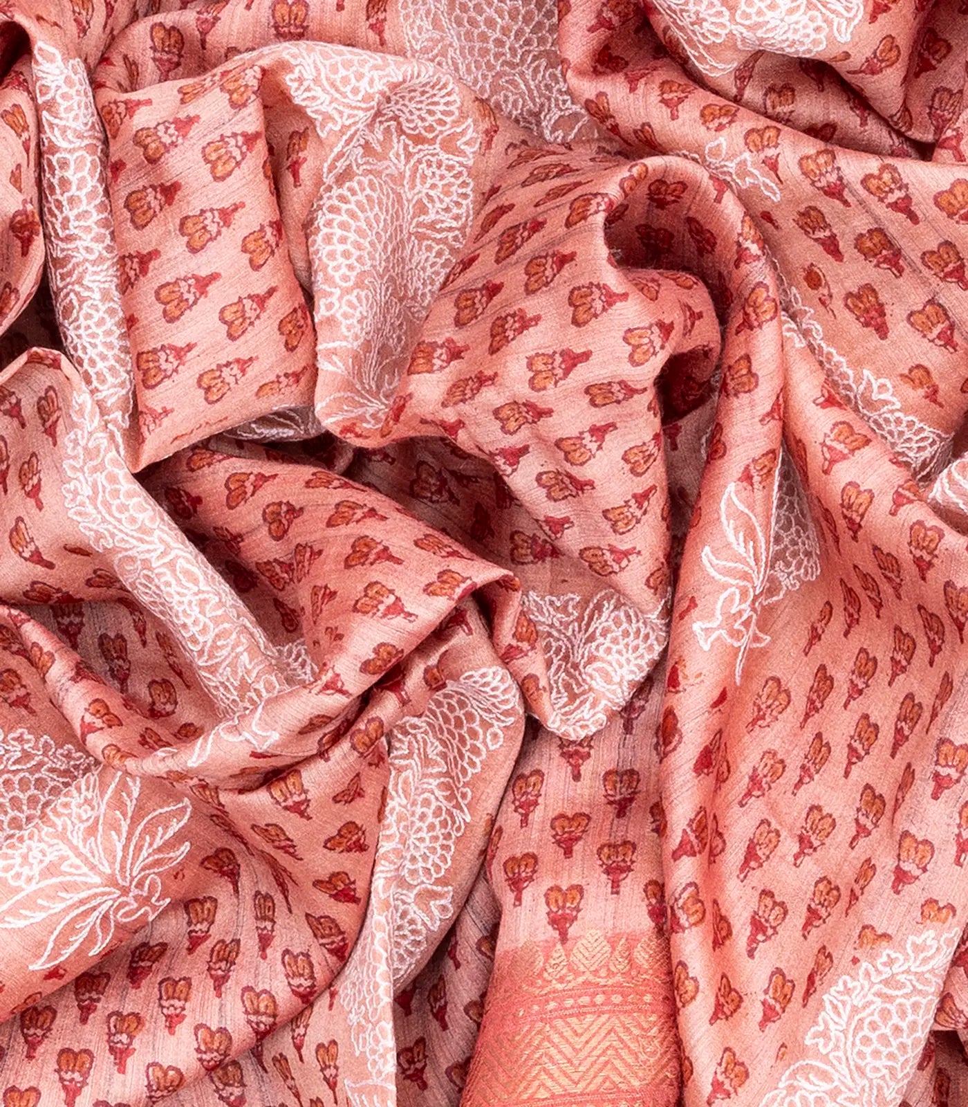 This Handwoven tussar silk saree is filled with printed floral & embroidered motifs in baby pink body along with border and pallu