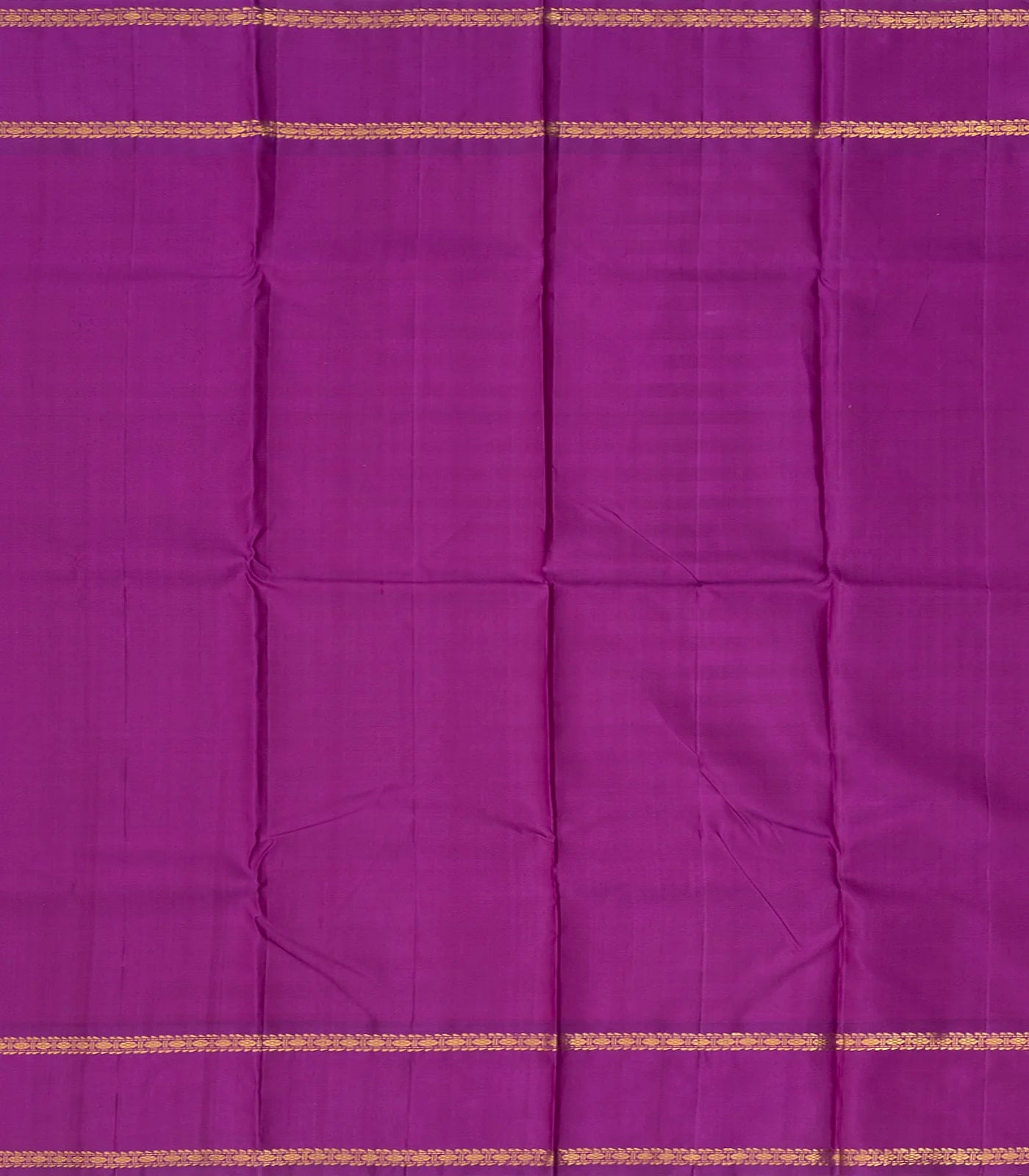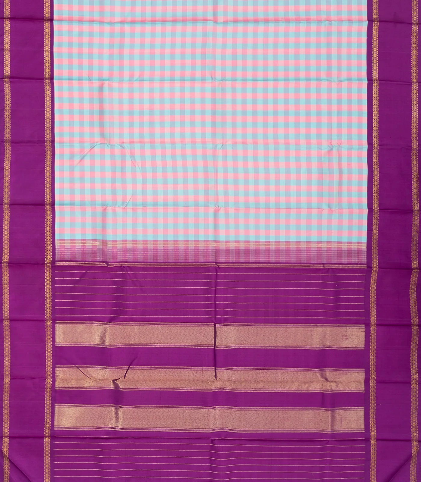 This handwoven korvai kanchipuram silk saree is filled with blue & baby pink checks in body along with traditional motifs in contrast purple zari border and pallu