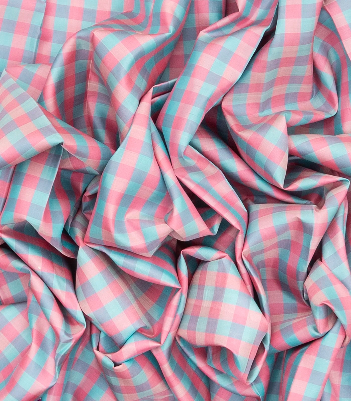 Baby Pink & Blue Handloom Korvai Kanchipuram Silk Saree With Checks