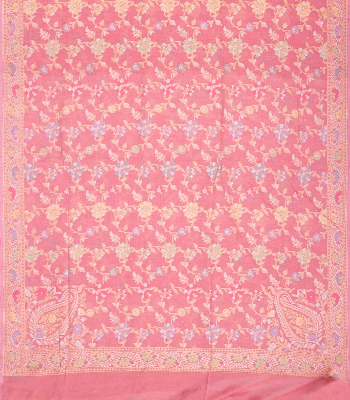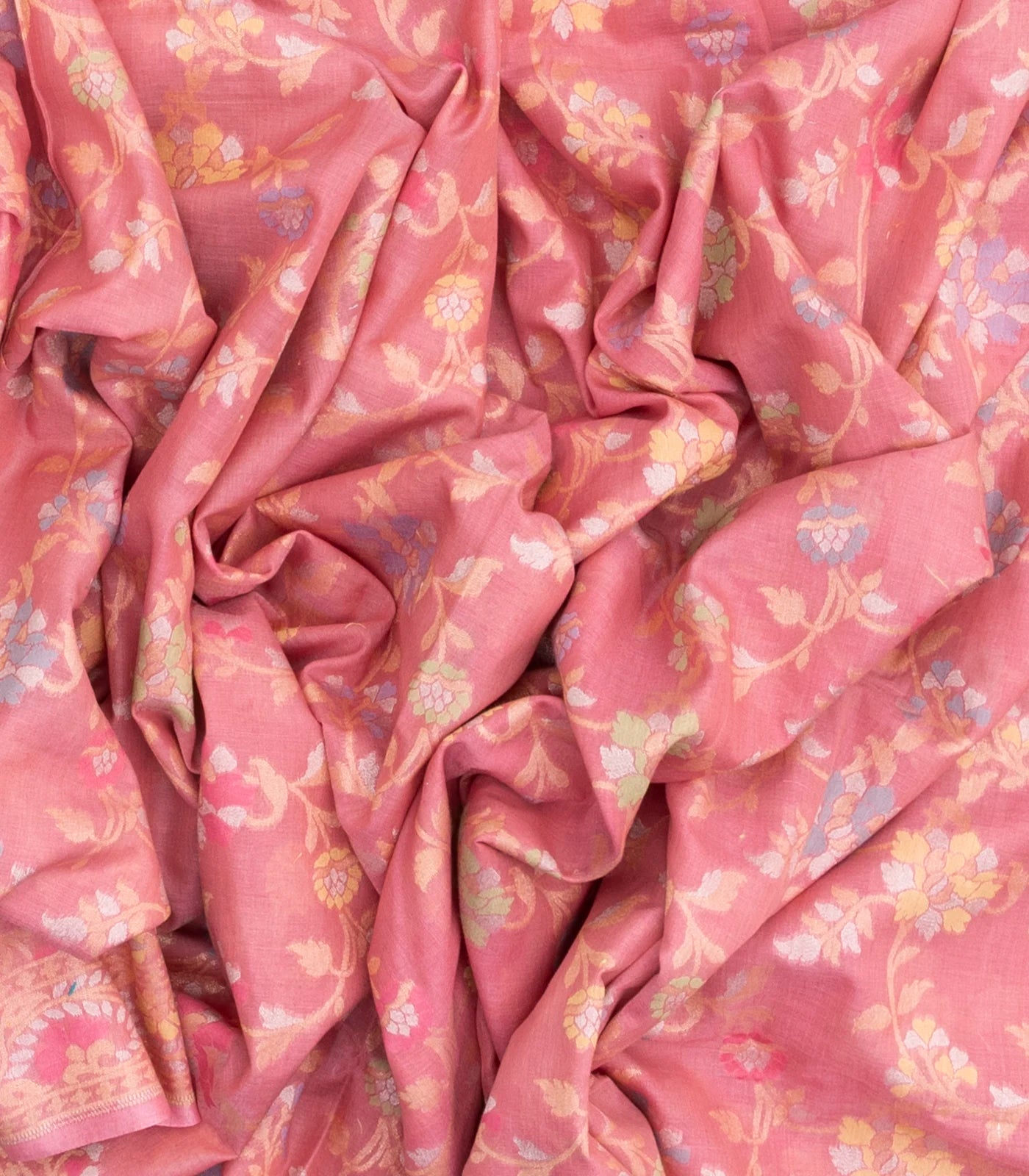 This handwoven banarasi silk saree is filled with meena floral vine & corner buttas motifs in baby pink body along with zari border and pallu