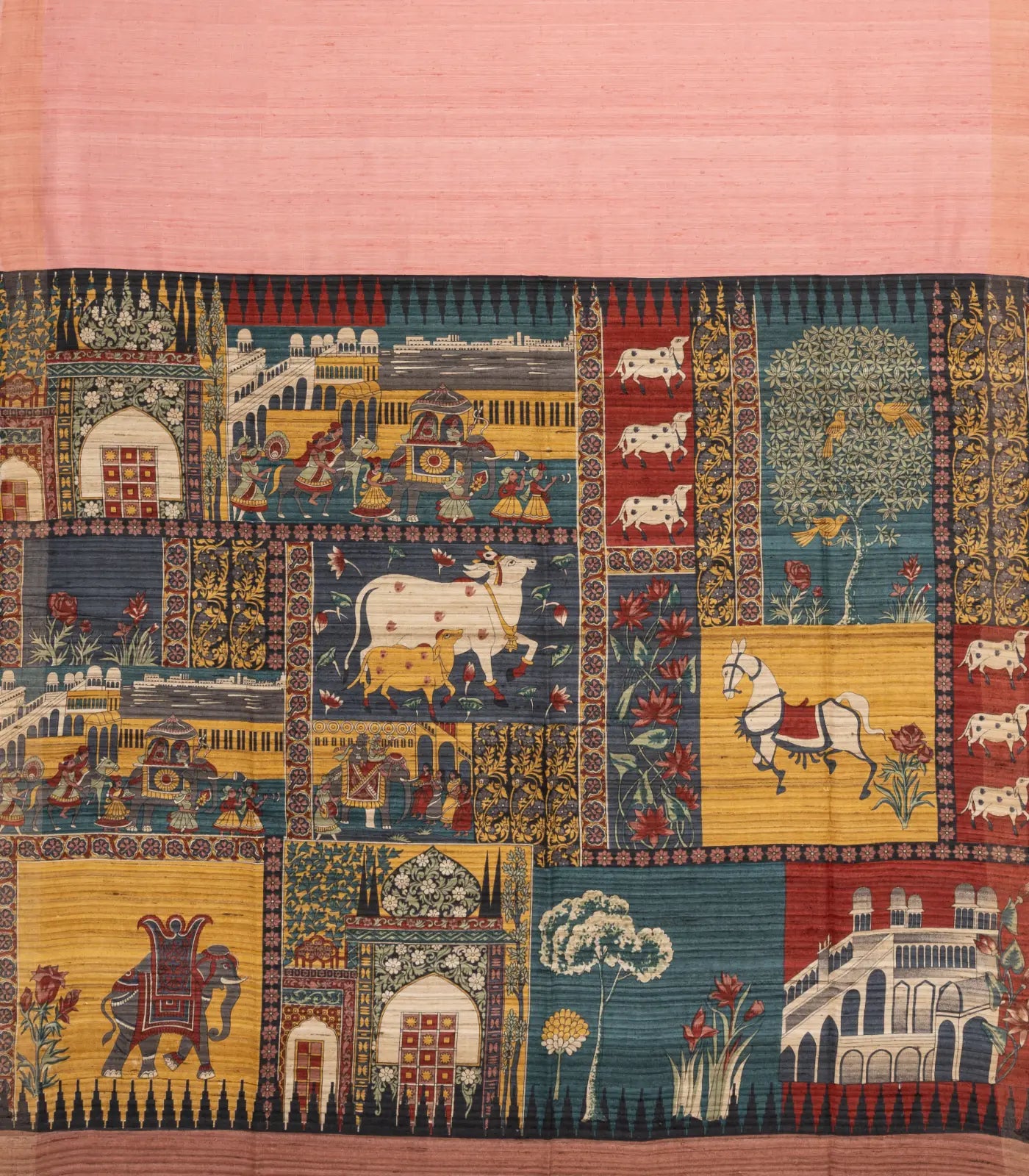 This handwoven dupion silk saree is filled with plain baby pink body along with border and printed pallu