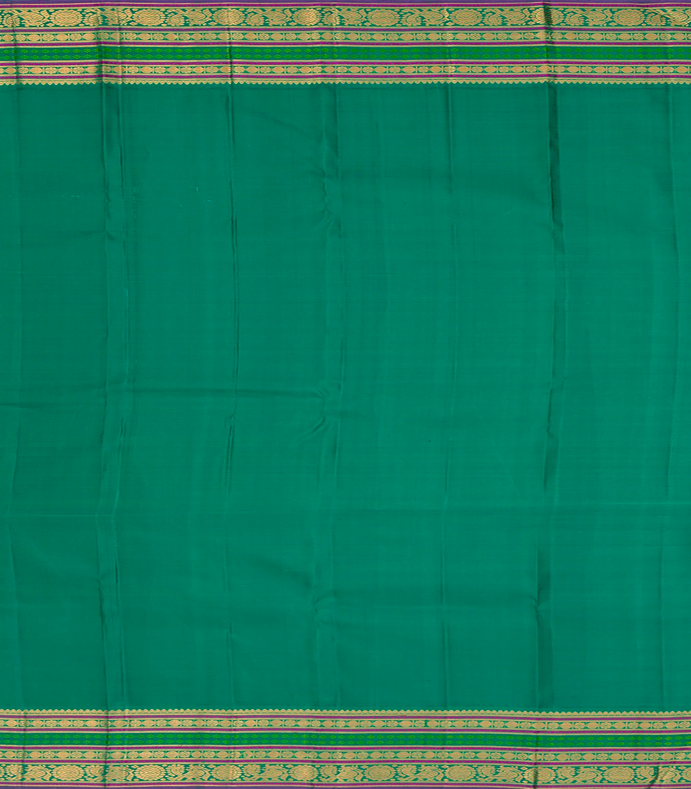 This handwoven kanchipuram silk saree is filled with checks in baby pink body along with contrast green zari border and pallu