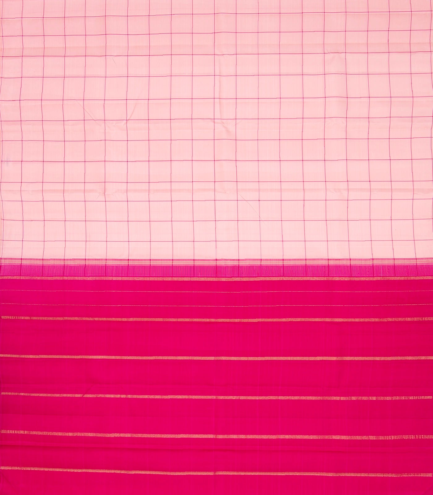 This handwoven kanchipuram silk saree is filled with silk checks in baby pink body along with contrast pink pallu