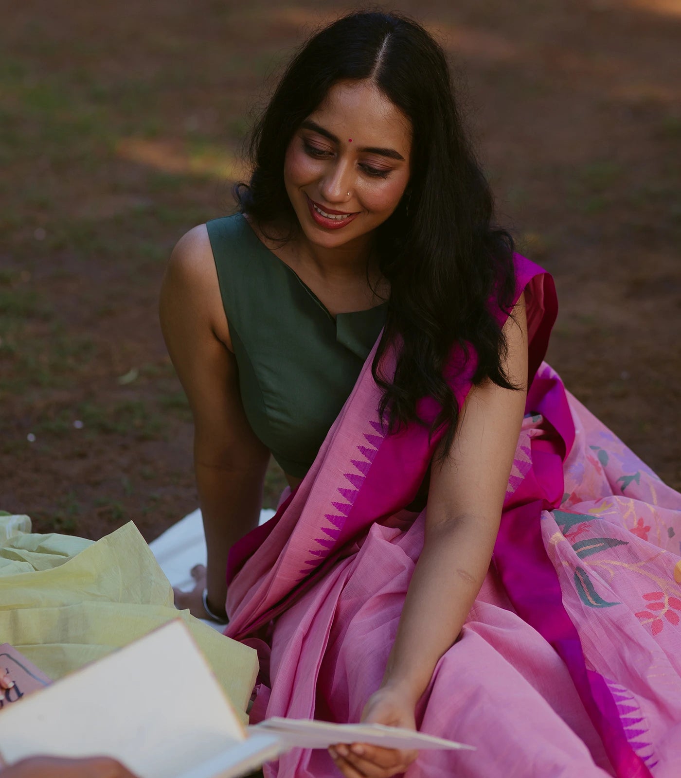This handwoven uppada khadi cotton saree with plain baby pink body aolng with meena jamdhani pallu