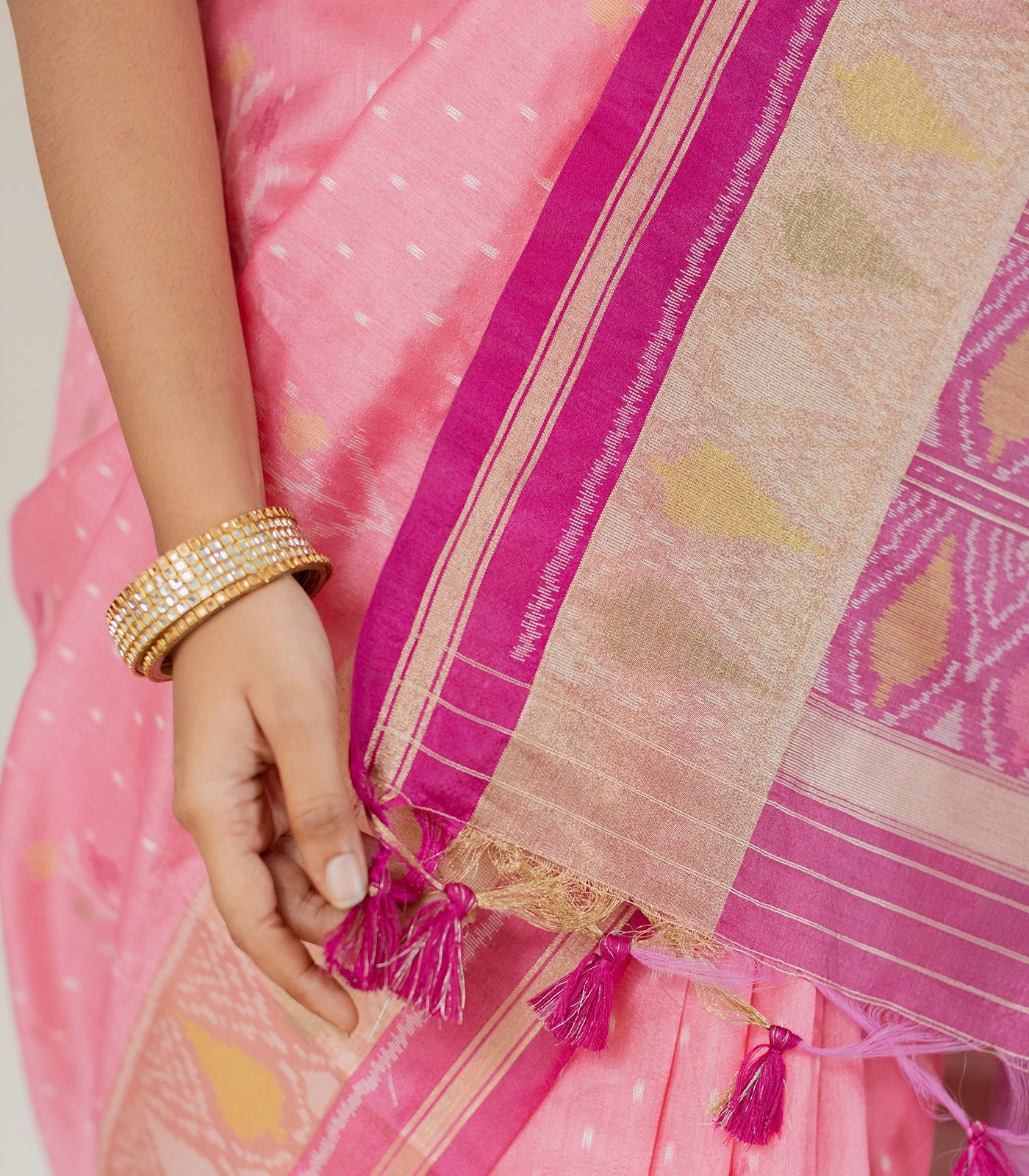 This woven art tussar silk saree with printed floral motifs in baby pink body along with border and pallu