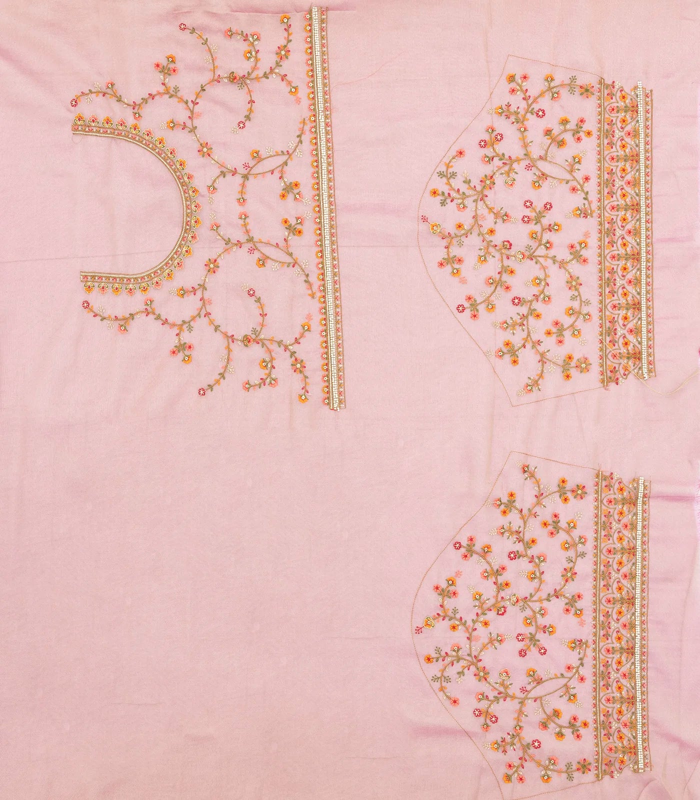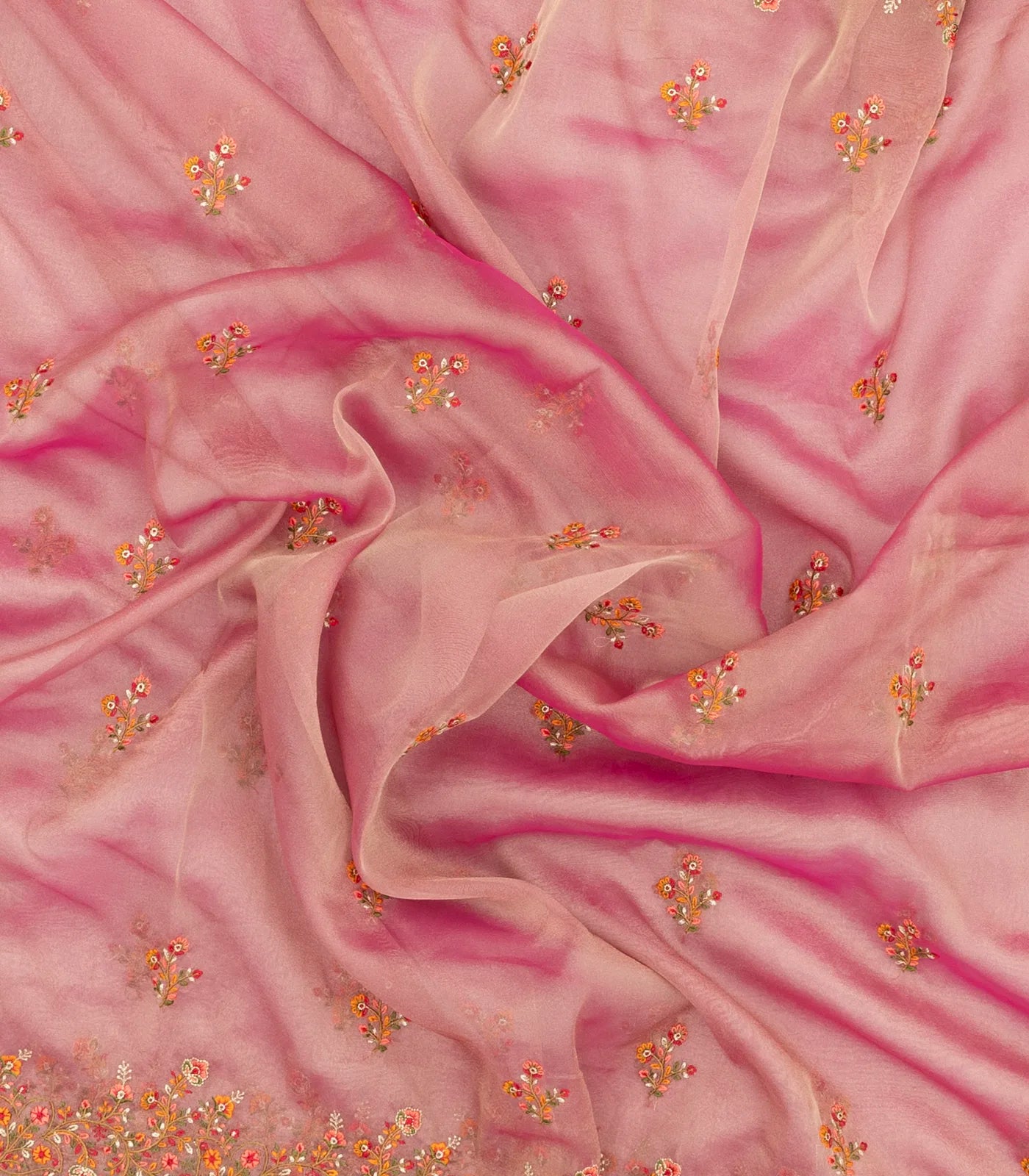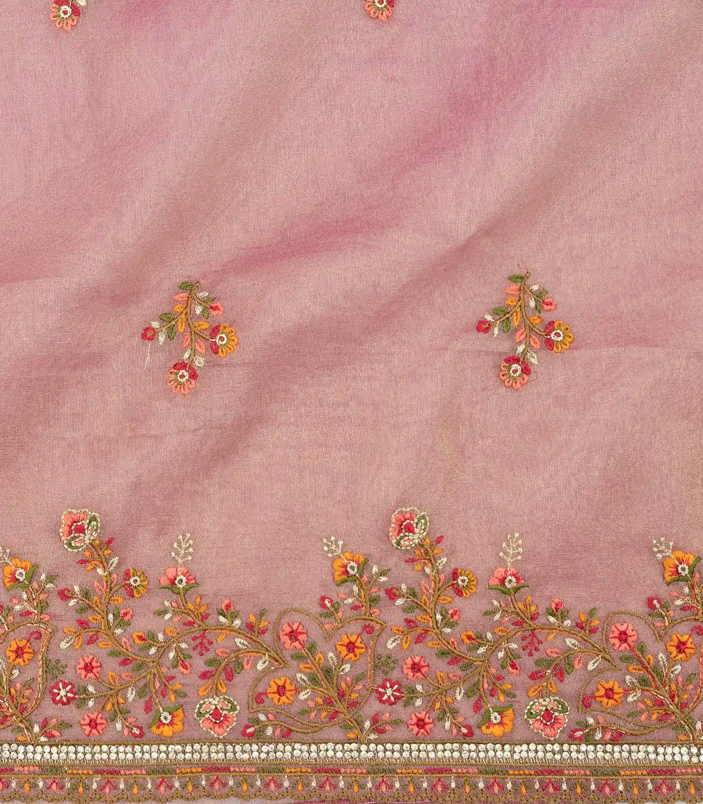 This woven blended tissue saree is filled with embroidered floral motifs in baby pink body along with border and pallu