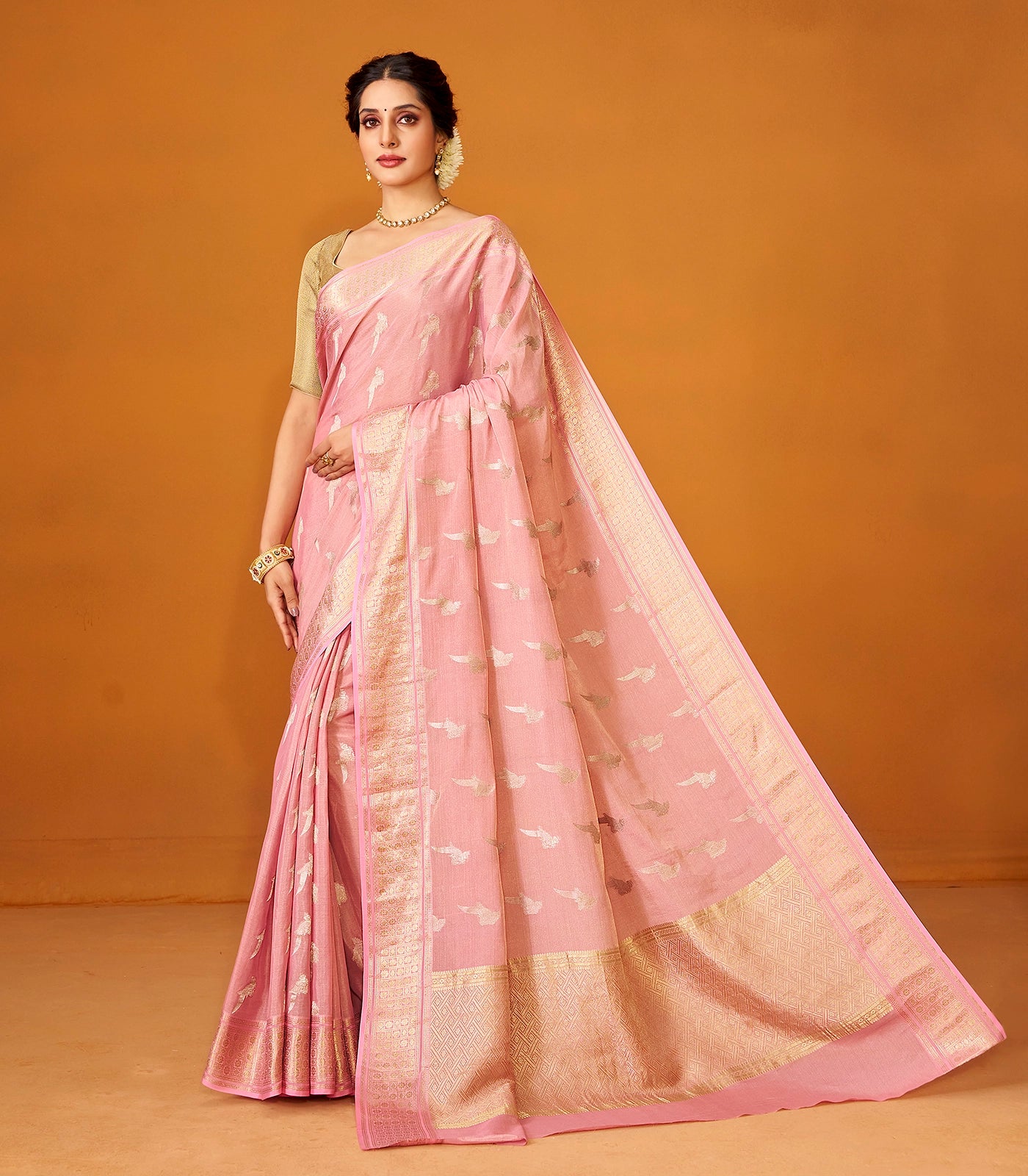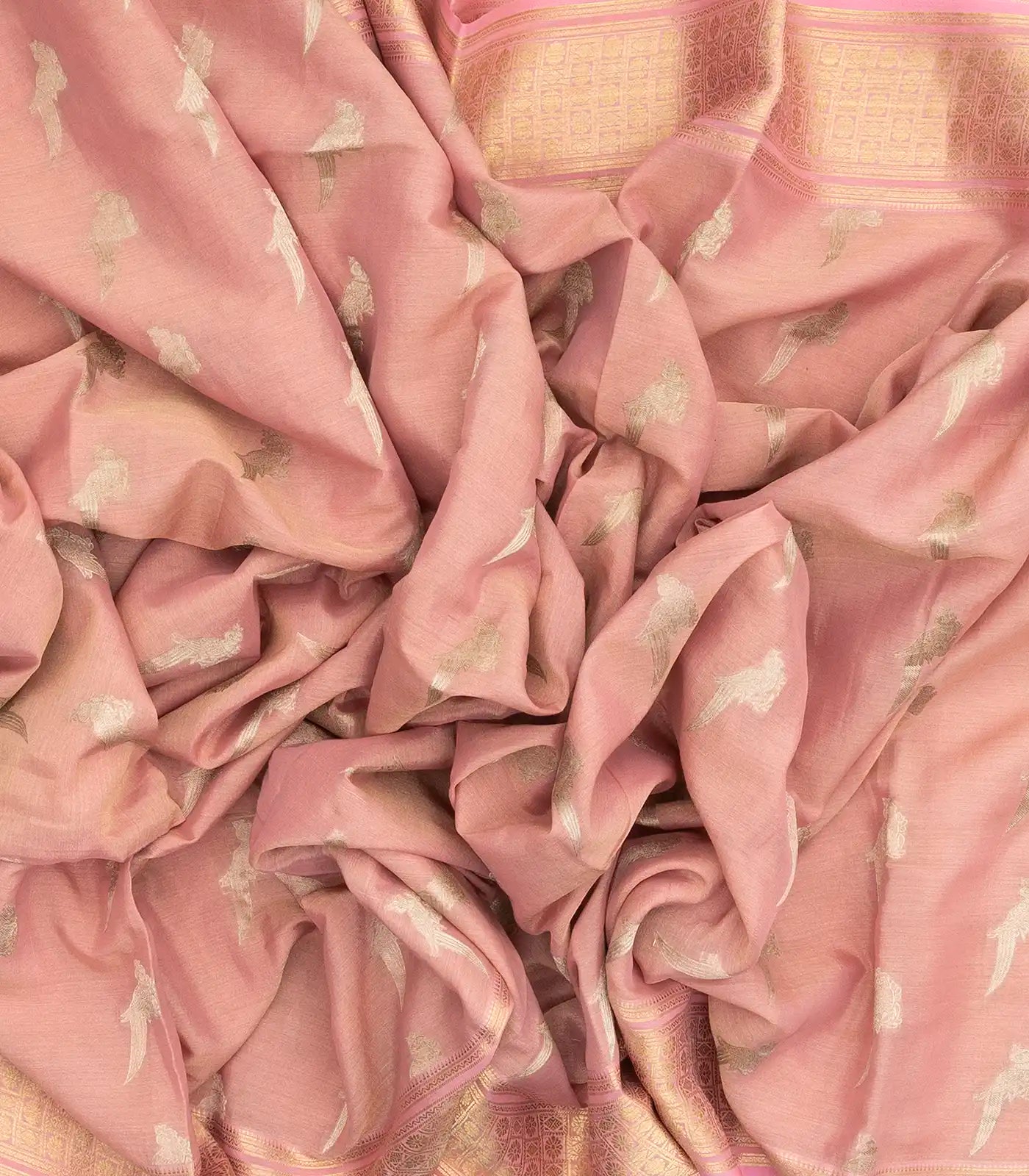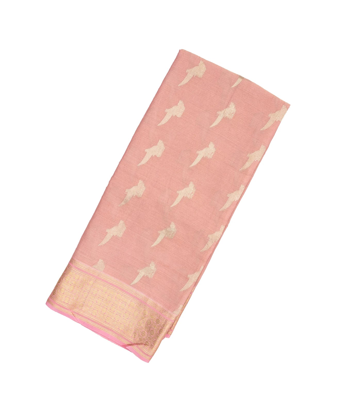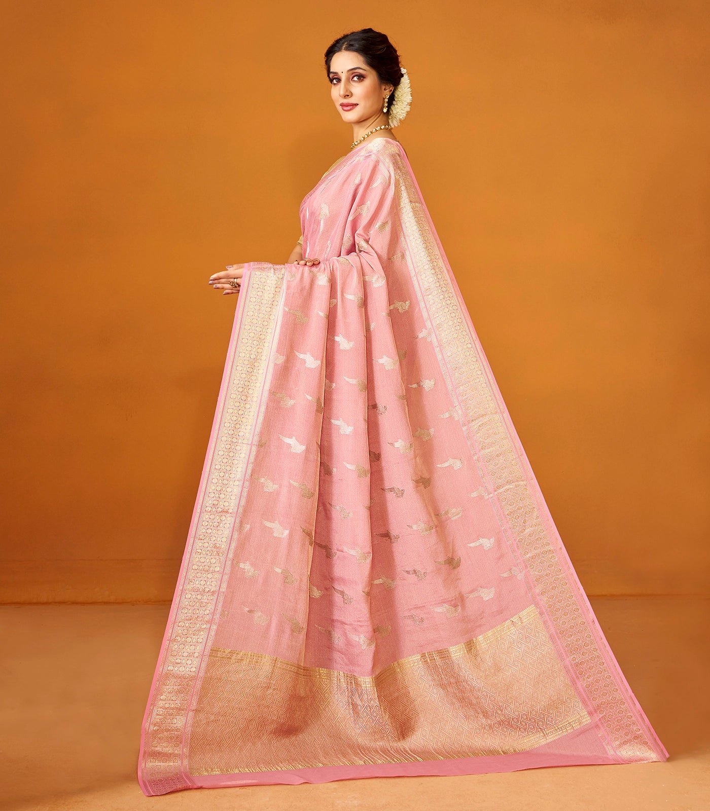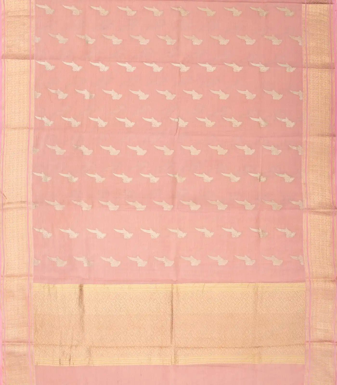 This woven mysore crepe silk saree filled with bird buttas in baby pink body along with zari border and pallu