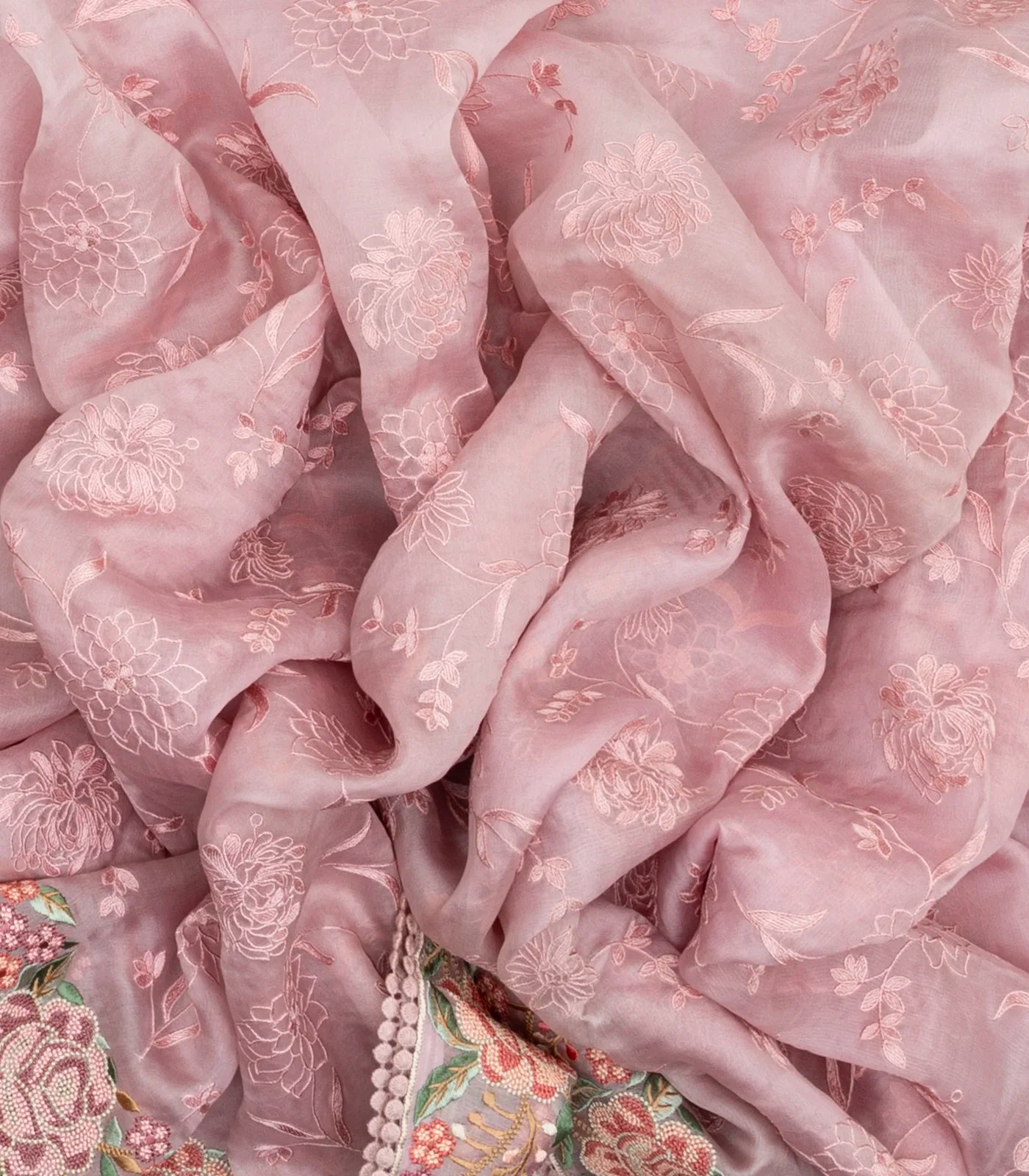 This woven organza saree filled with embroidered floral vine motifs in baby pink body along with meena border and pallu
