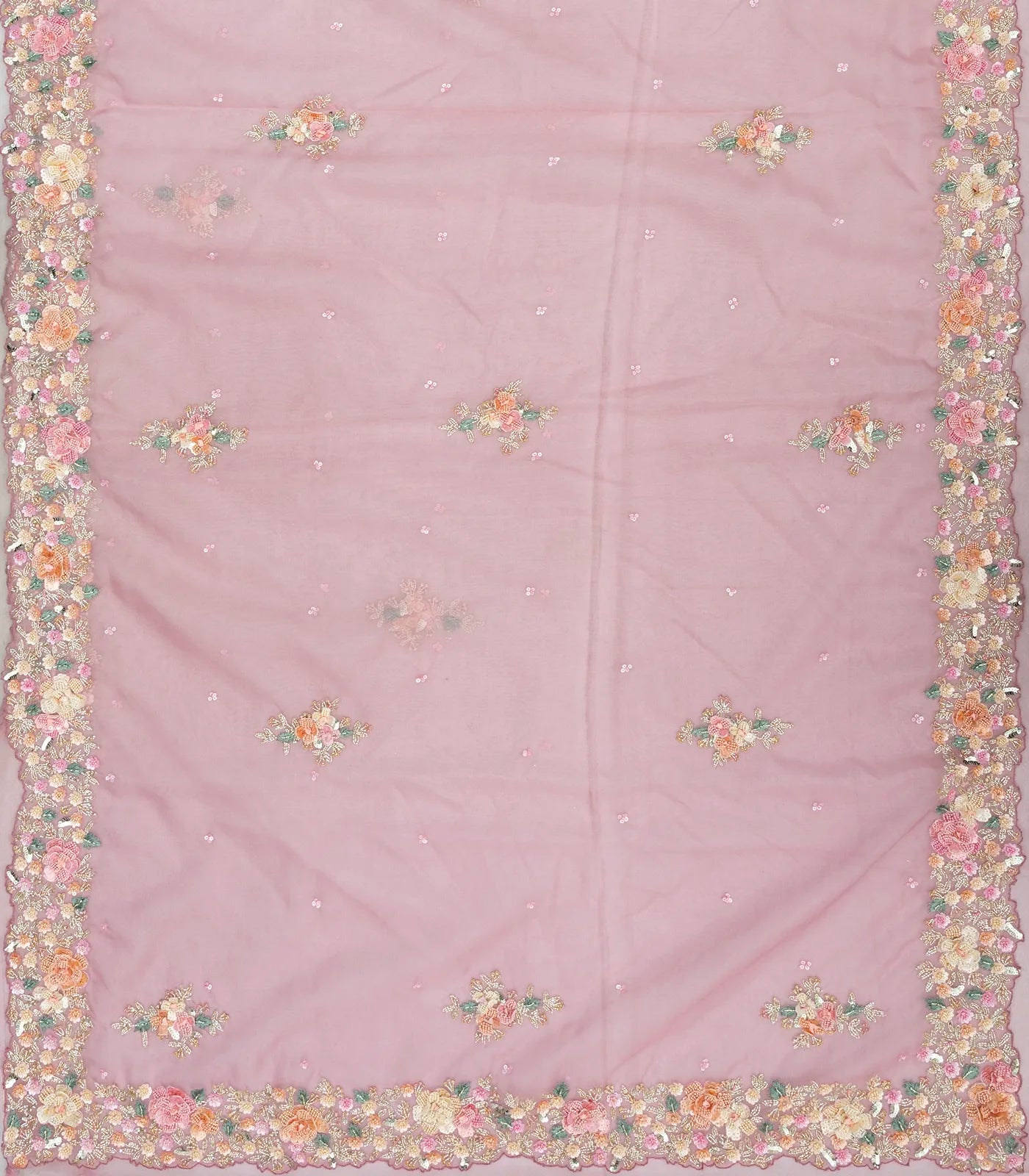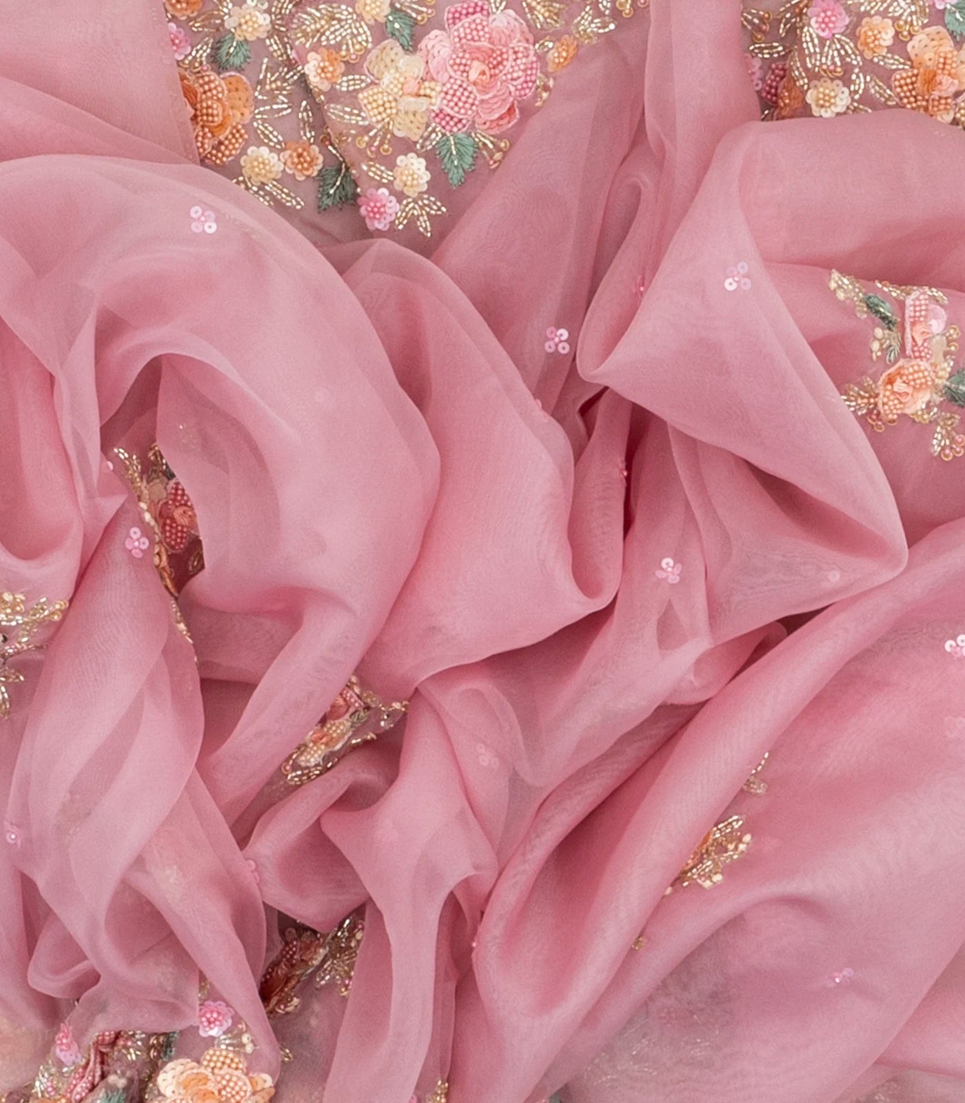 This woven organza saree is filled with hand embroidered floral motifs in baby pink body along with border and pallu