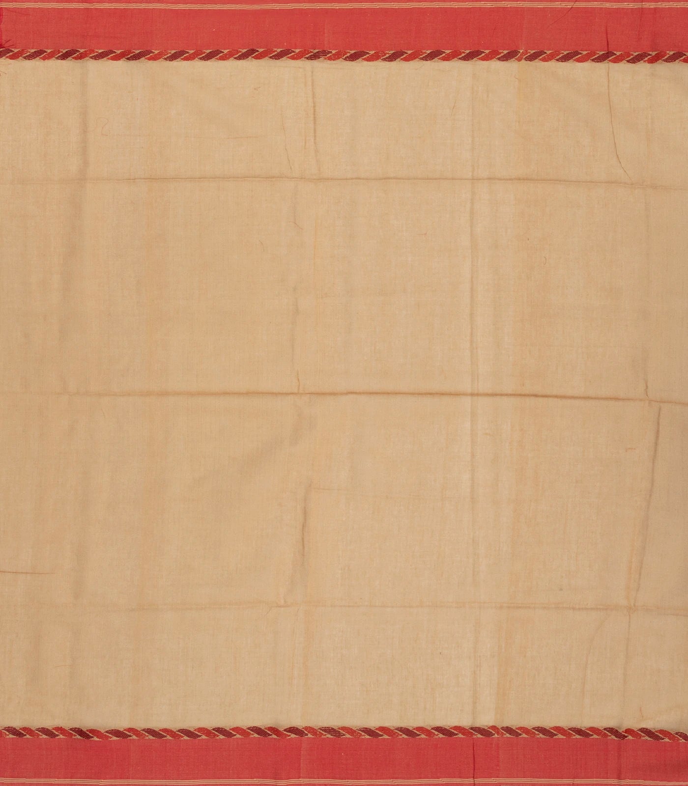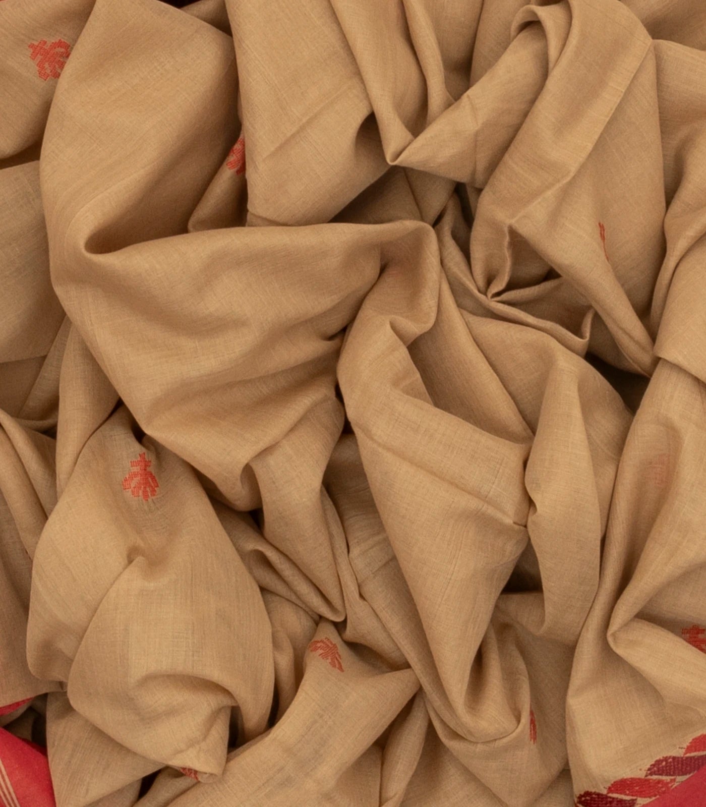 This handwoven bengal cotton saree is filled with floral buttas in beige body along with contrast border and pallu