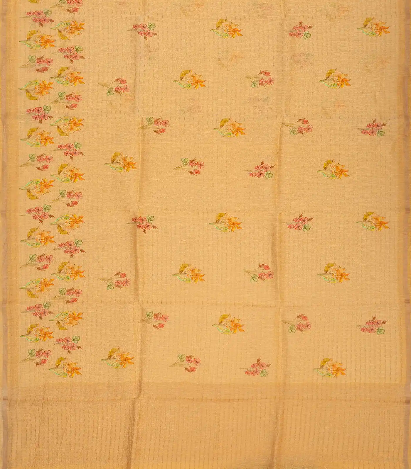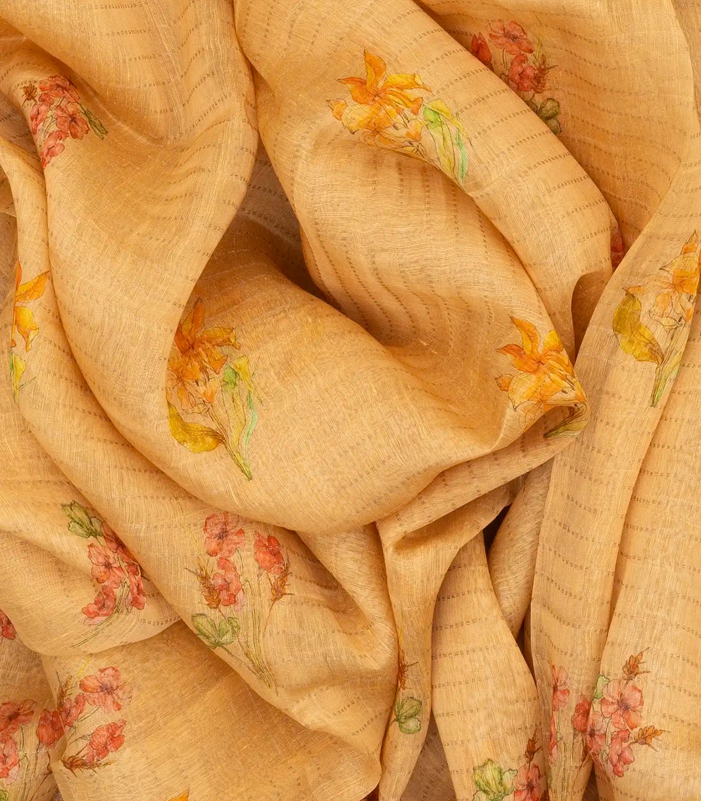 Beige Handwoven Linen Saree Printed With Flower Motifs