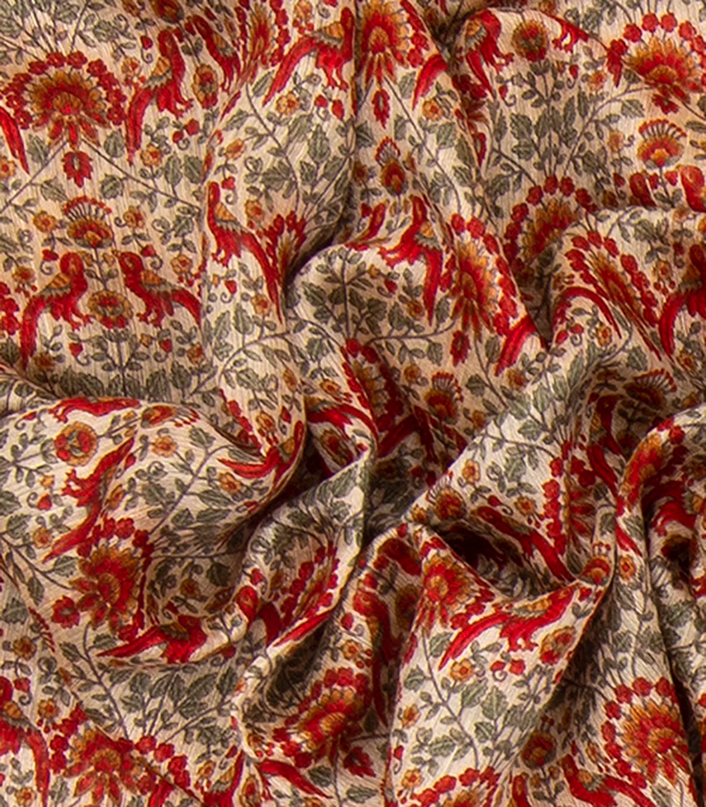 Beige Handwoven Printed Tussar Silk Saree With Bird Motifs and Contrast Red Border-Beige
