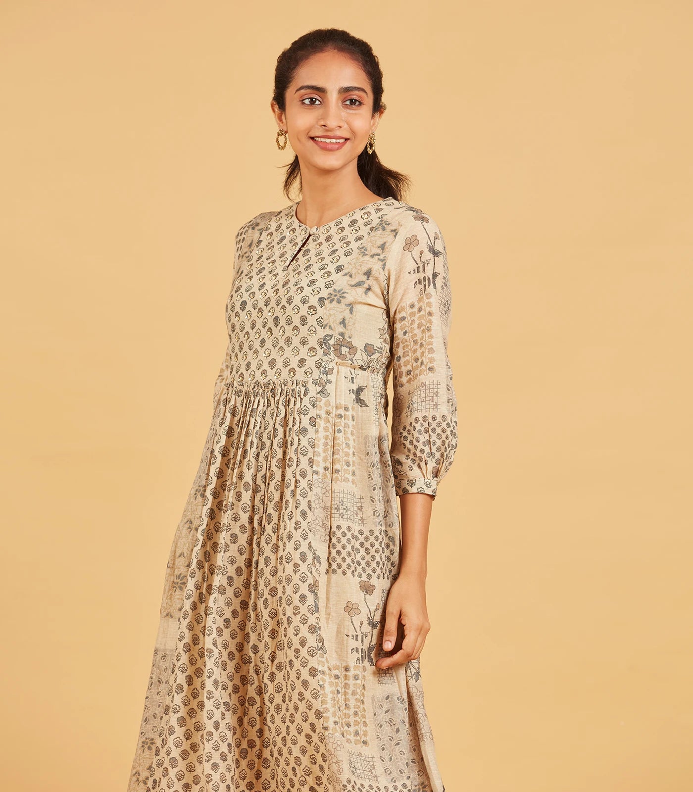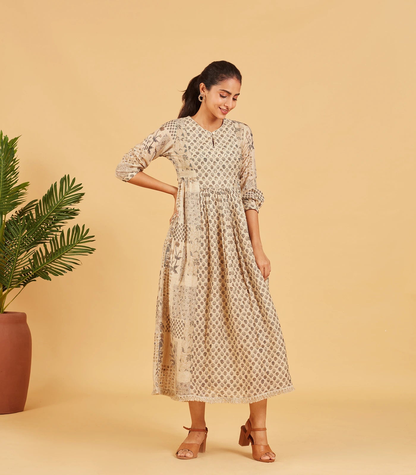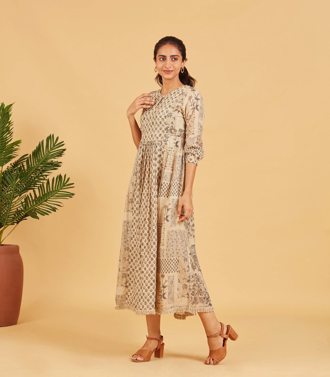This elegant dress exudes a timeless charm with its intricate print design and soft, flowing silhouette. Crafted from a lightweight and breathable fabric, it offers comfort and ease of wear. The dress features a beautiful all-over print of delicate floral motifs and geometric patterns, creating a captivating visual appeal. The ¾th sleeves and round neckline add a touch of classic elegance, while the relaxed fit allows for effortless movement. The dress is finished with a subtle frayed hem, adding a bohemian touch.