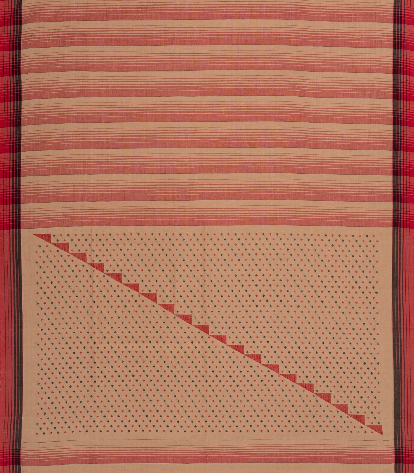 This handwoven bengal cotton saree is filled with beige & red stripes in body along with contrast border and pallu