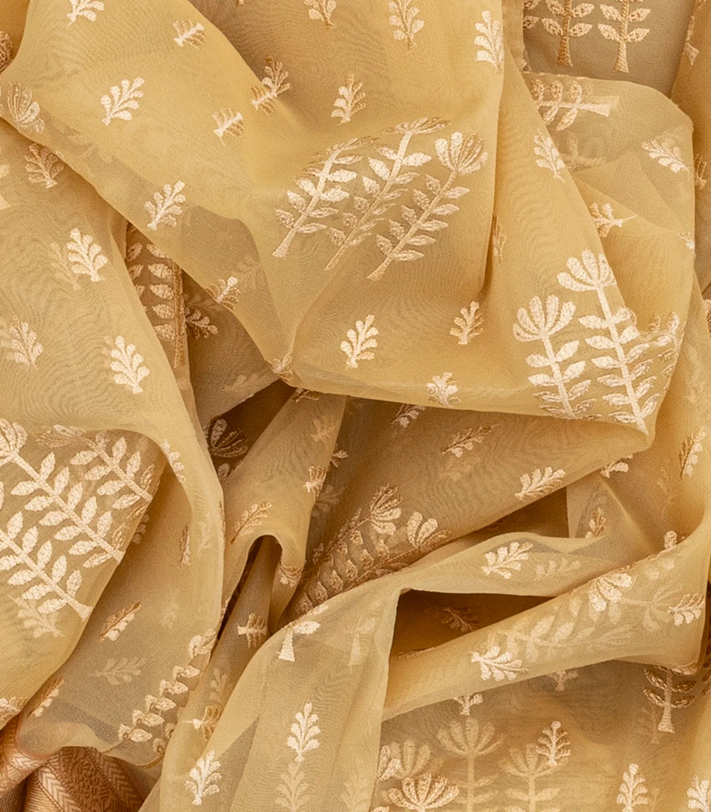 Beige Woven Blended Organza Saree With Floral Motifs-Beige