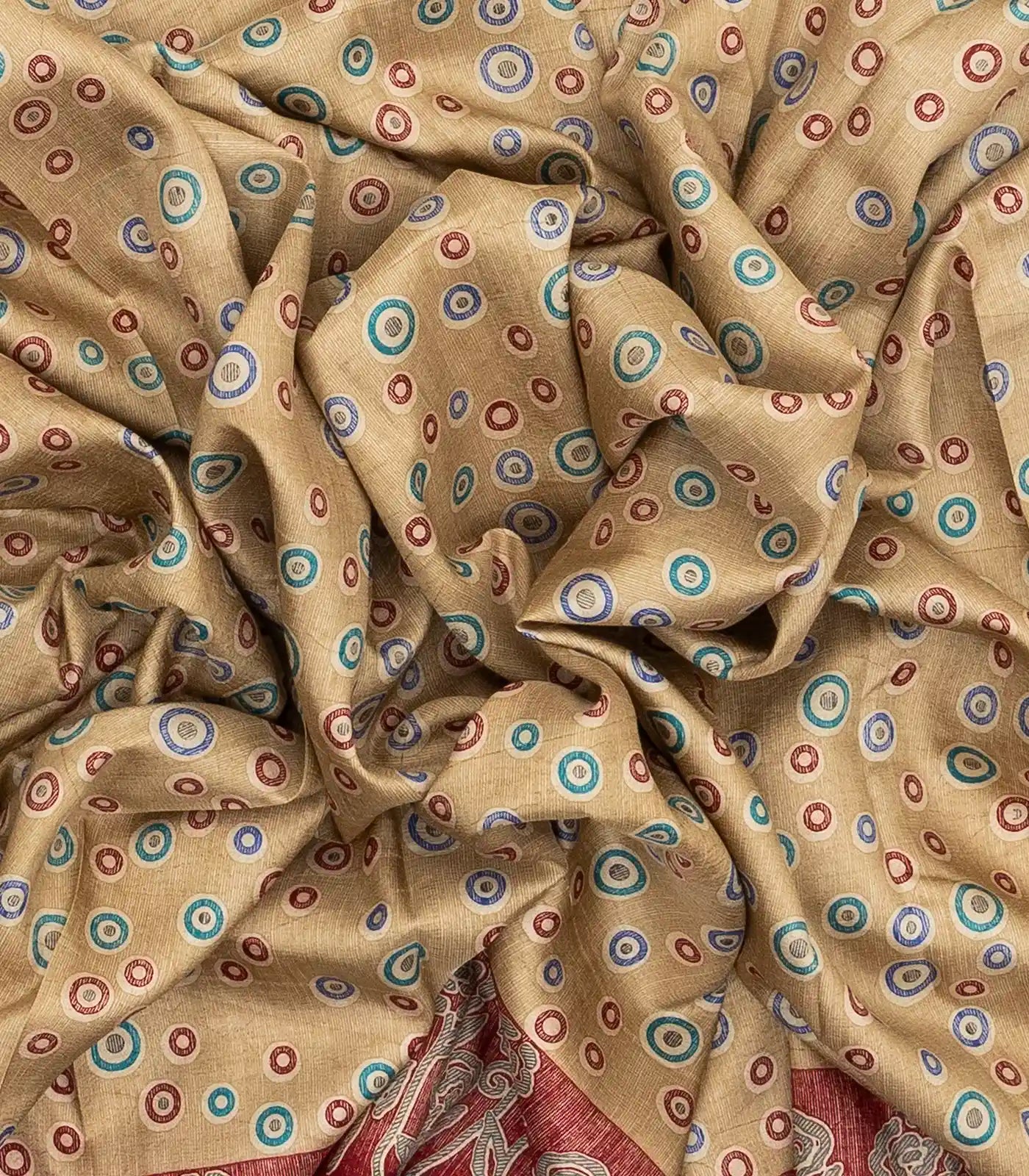 This woven synthetic silk saree is filled with printed floral motifs in beige body along with contrast border and pallu