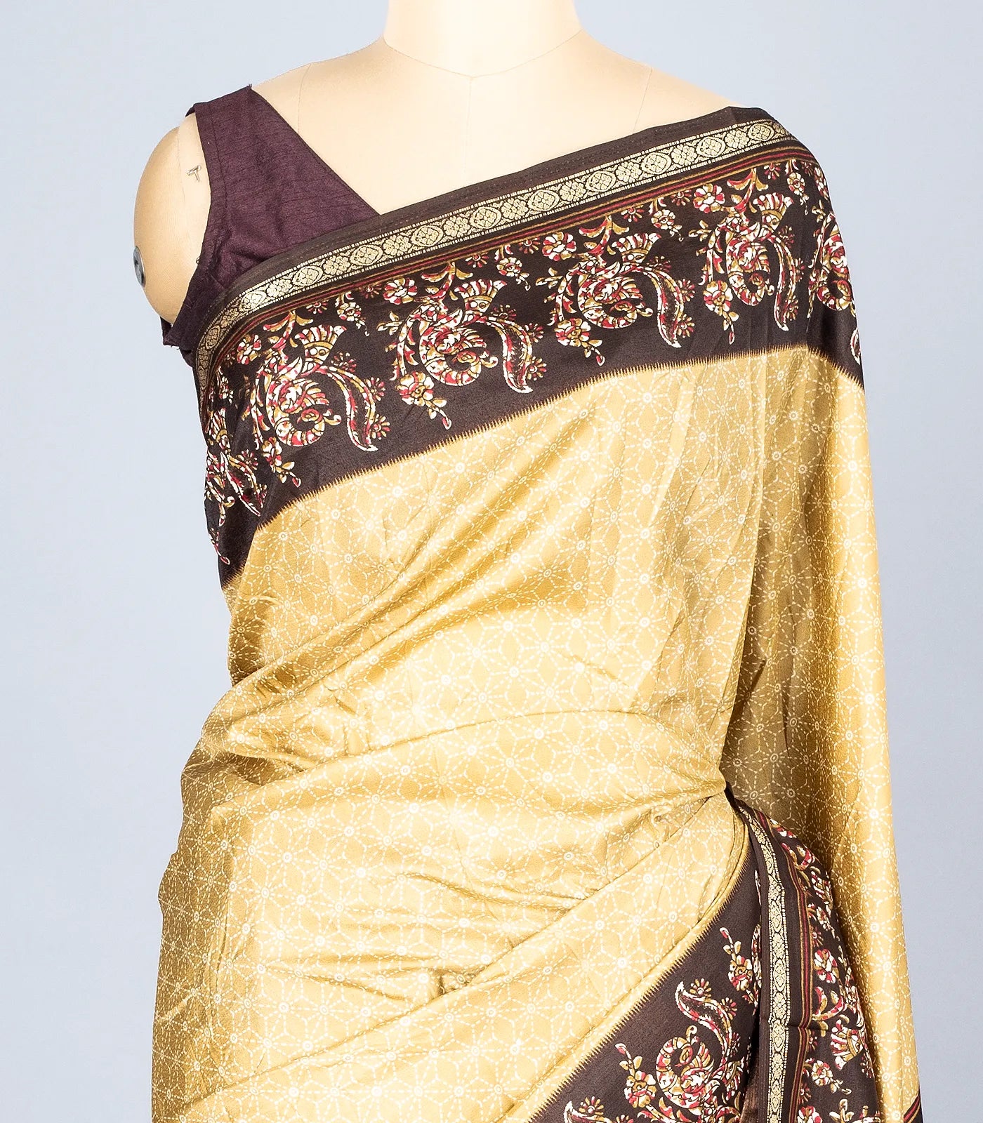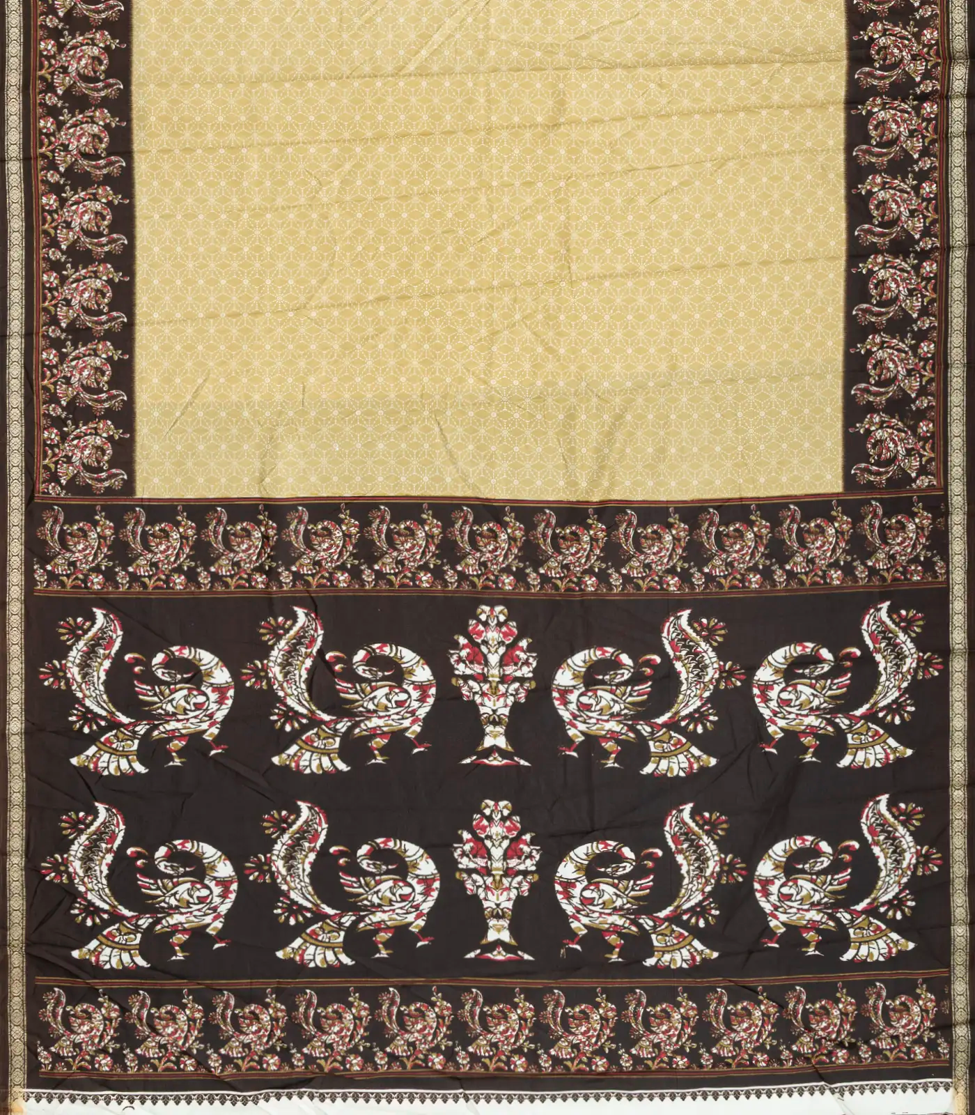 This woven synthetic crackle saree is filled with printed geometric & bird motifs in beige body along with contrast border and pallu