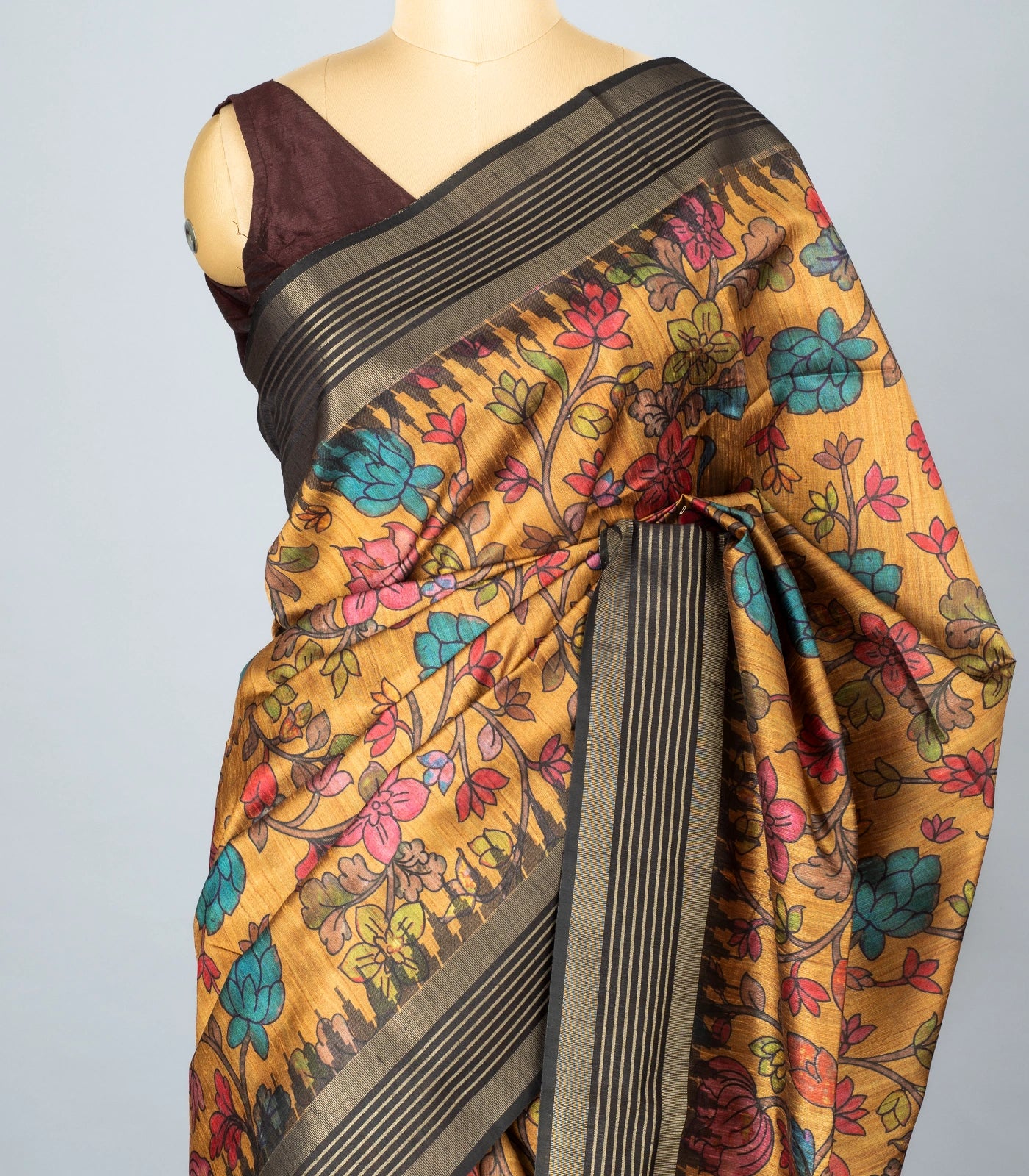 This woven synthetic dupion saree is filled with printed kalamkari motifs in beige body along with border and pallu