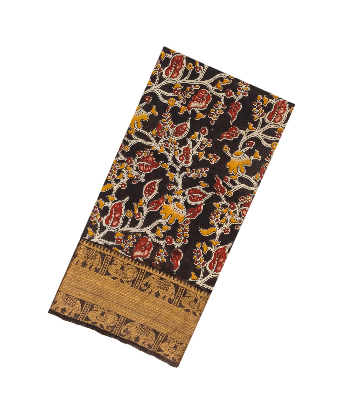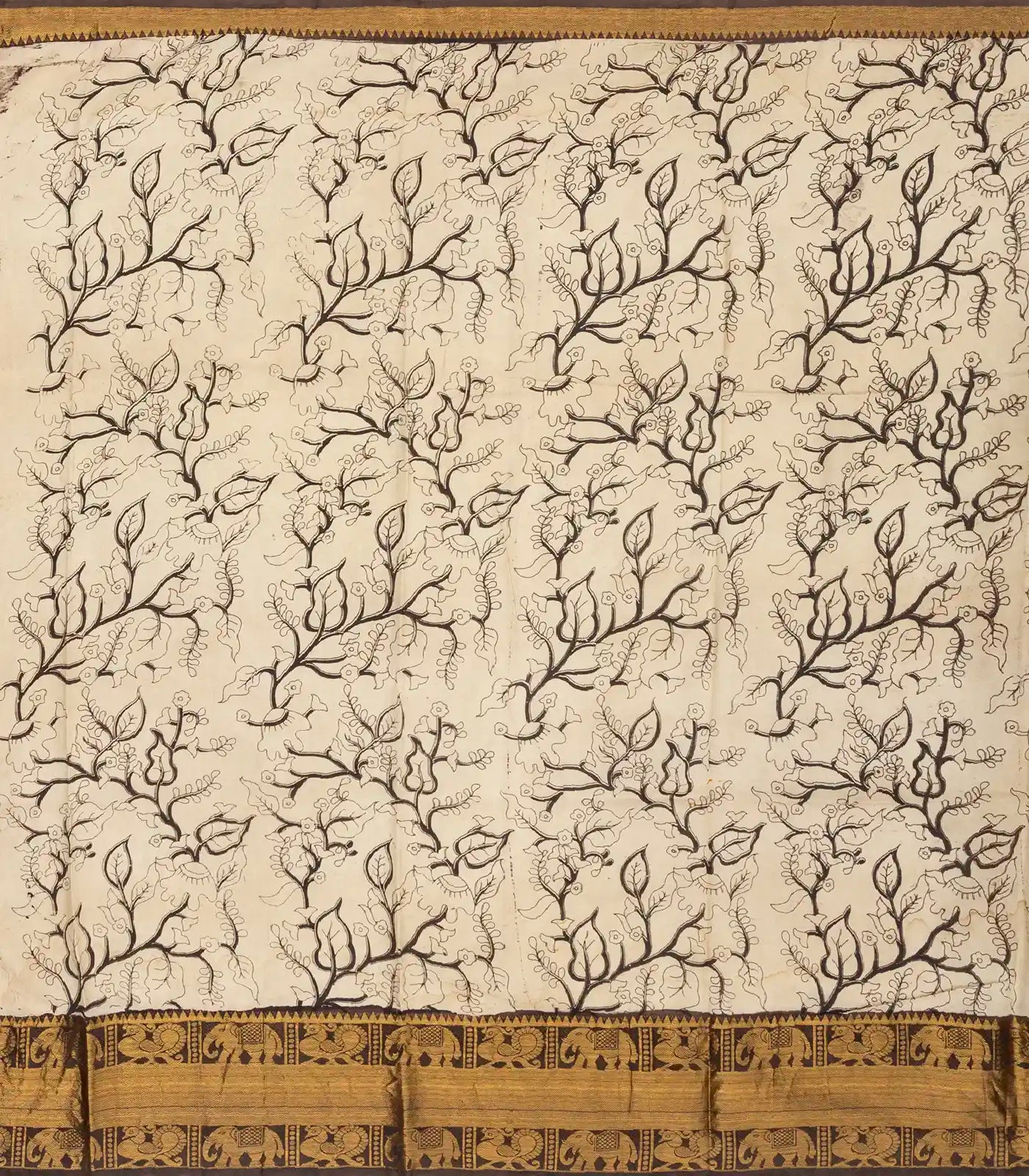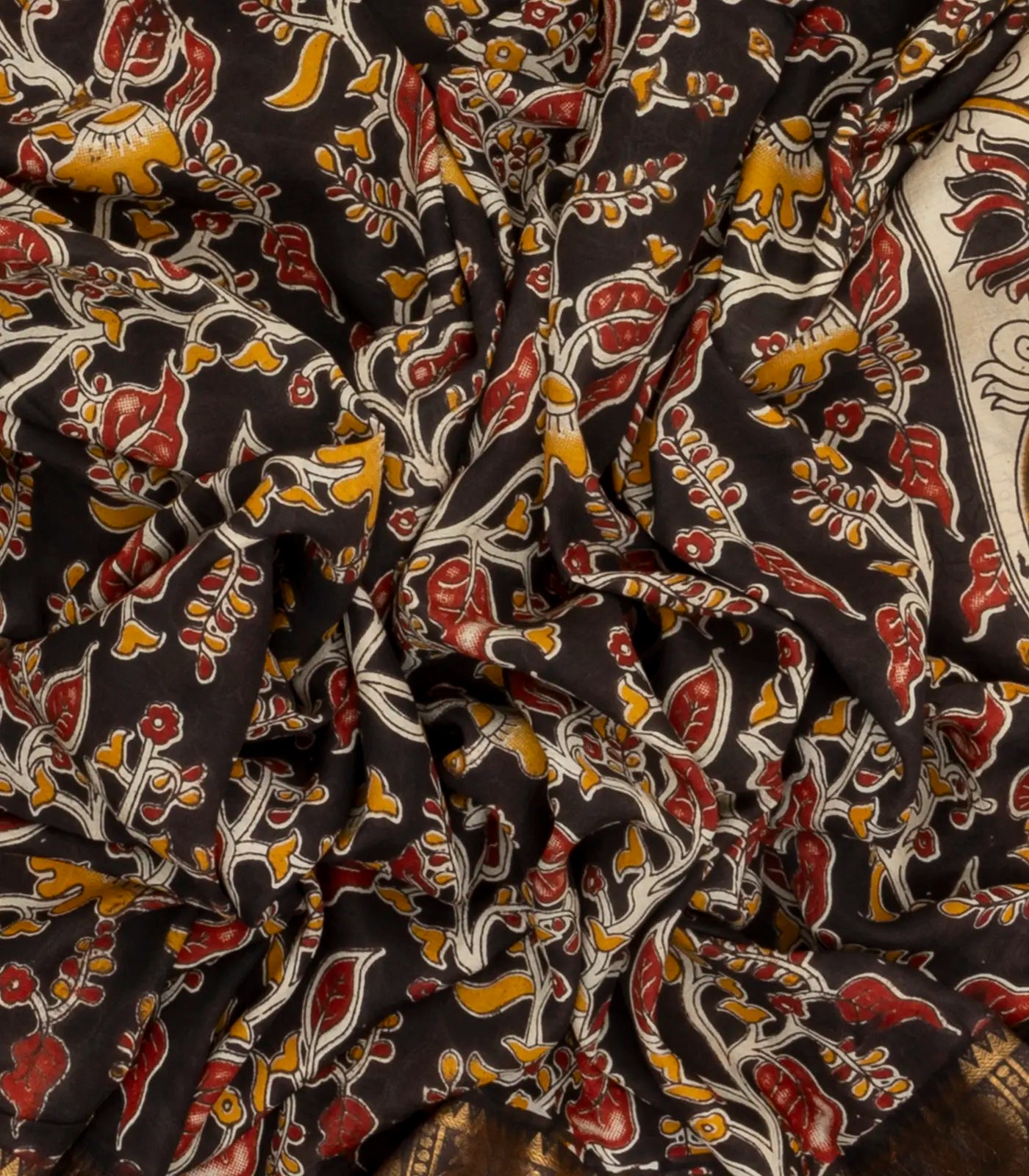 This woven blended silk saree is printed with kalamkari Krishna motifs in black body along with contrast border and pallu