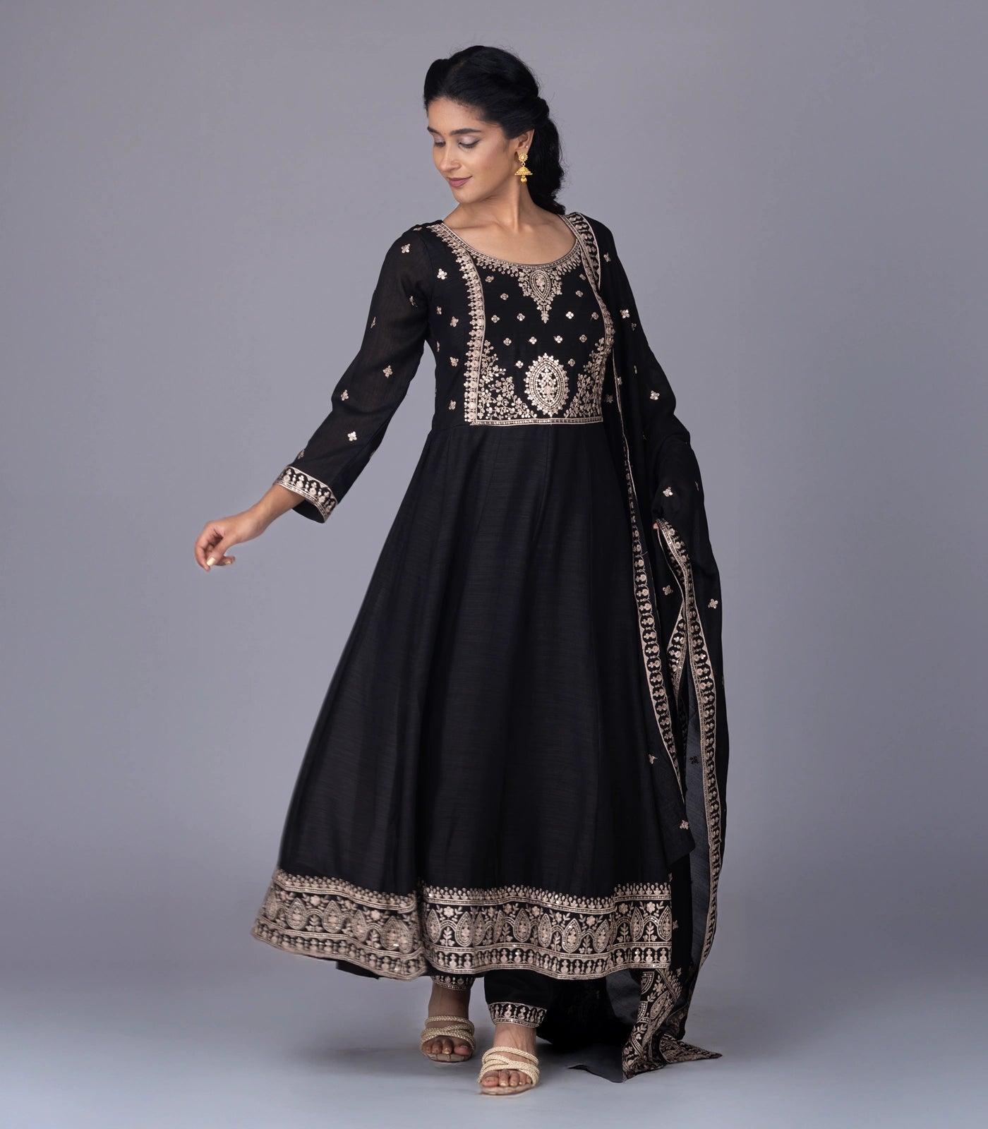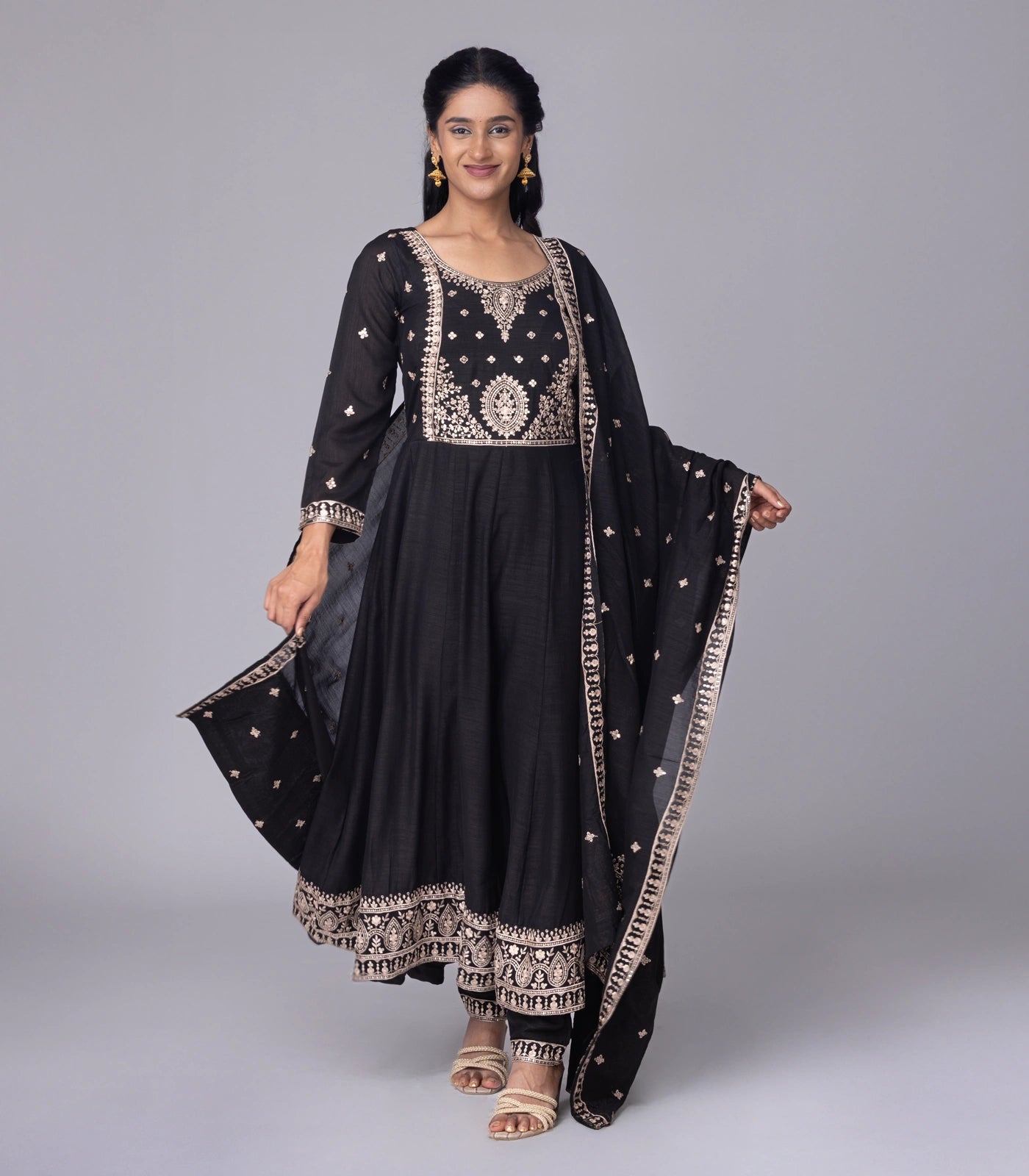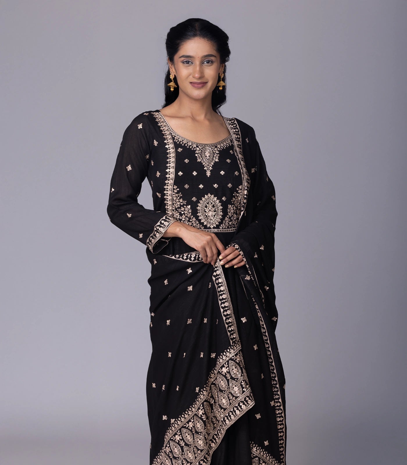 ● Round neckline with intricate embroidery detailing at the centre front ● Long sleeves with embroidery detailing ● Paired with matching straight fit trousers and embroidered dupatta