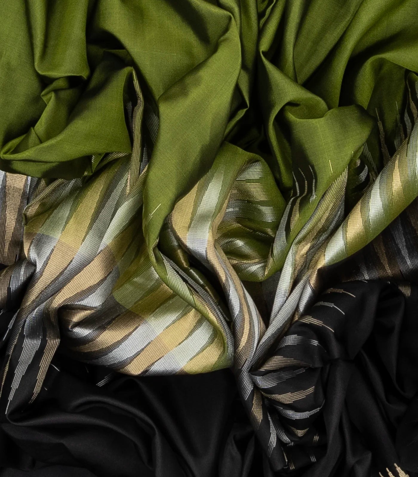 This handwoven banarasi half & half silk saree is filled with green & black body along with temple border and pallu