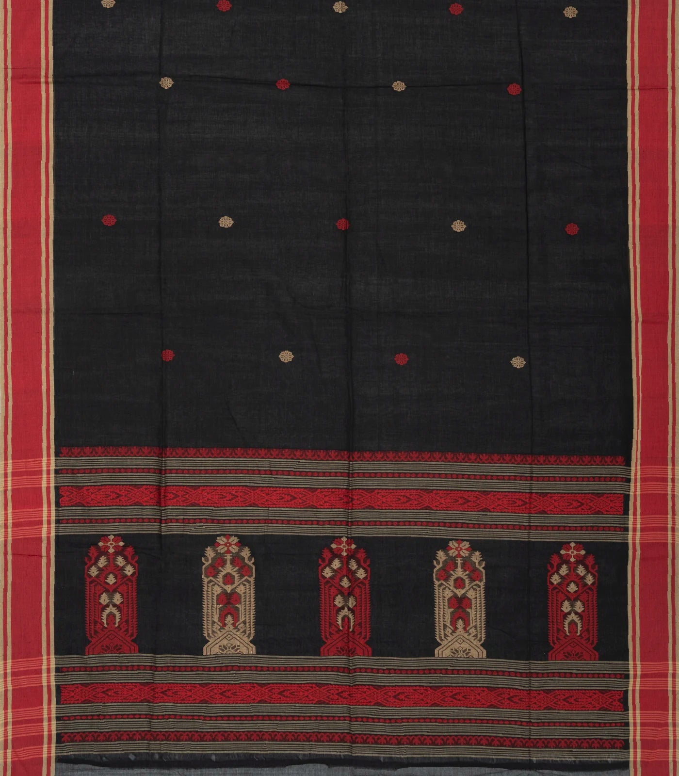 This handwoven bengal cotton saree is filled with floral buttas in black body along with contrast border and floral pallu