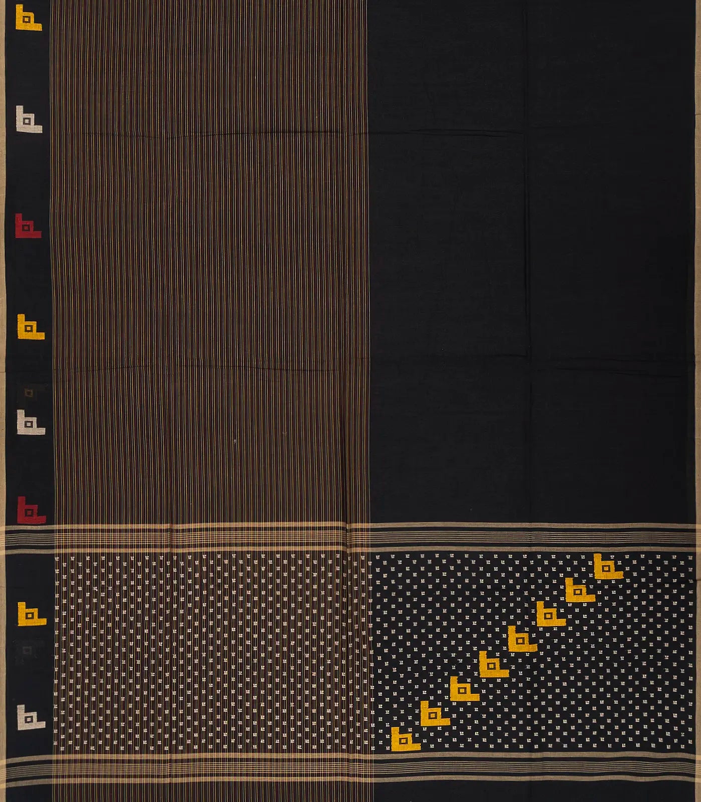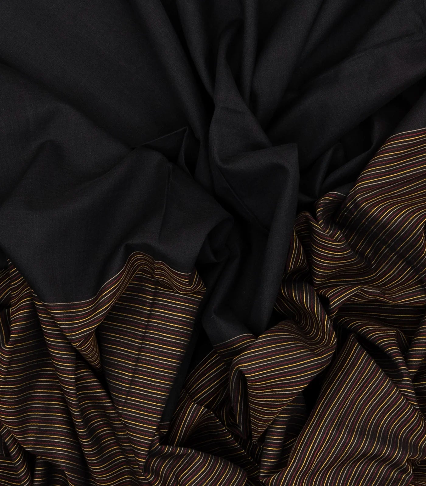 This handwoven bengal cotton saree is filled with stripes in black body along with contrast border and pallu