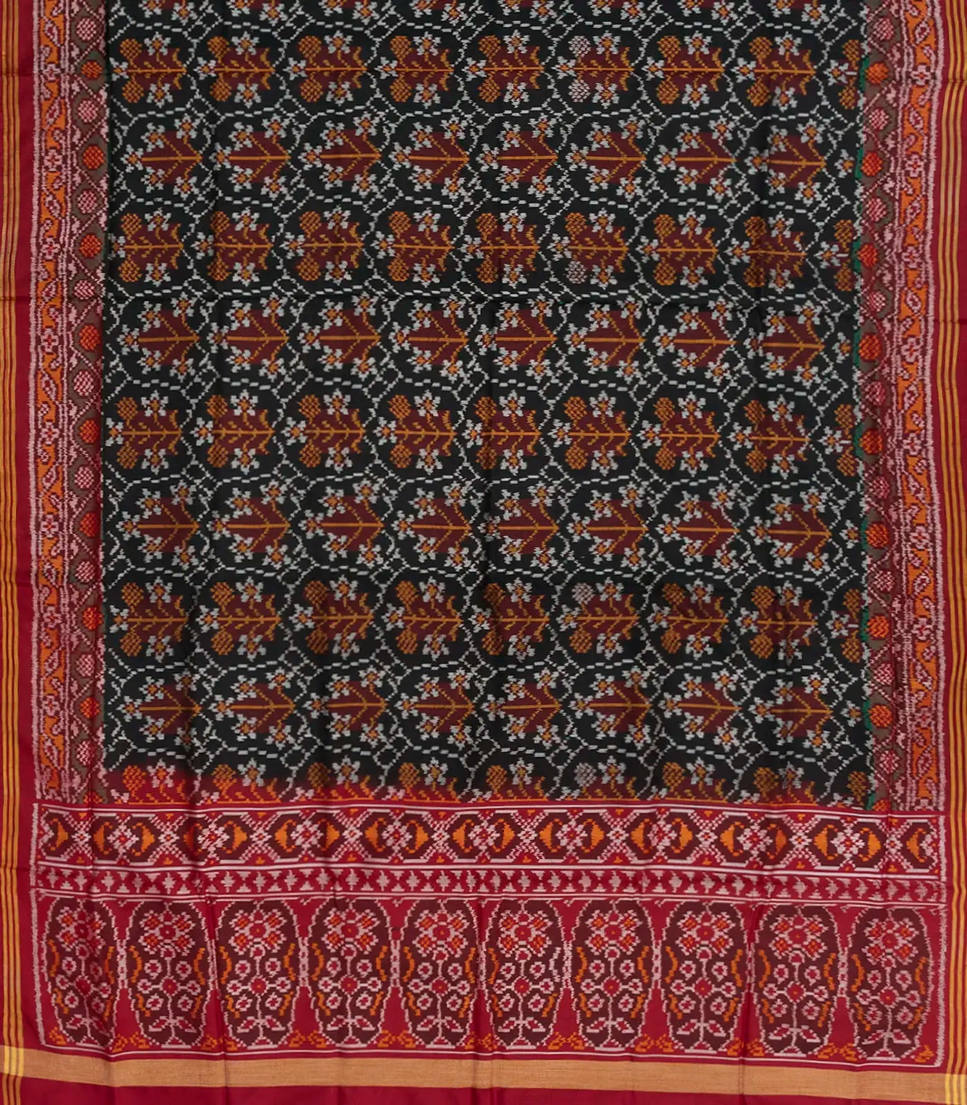 Black Handloom Double Ikat Silk Saree With Geometric Floral Motifs & Crimson Border-Black