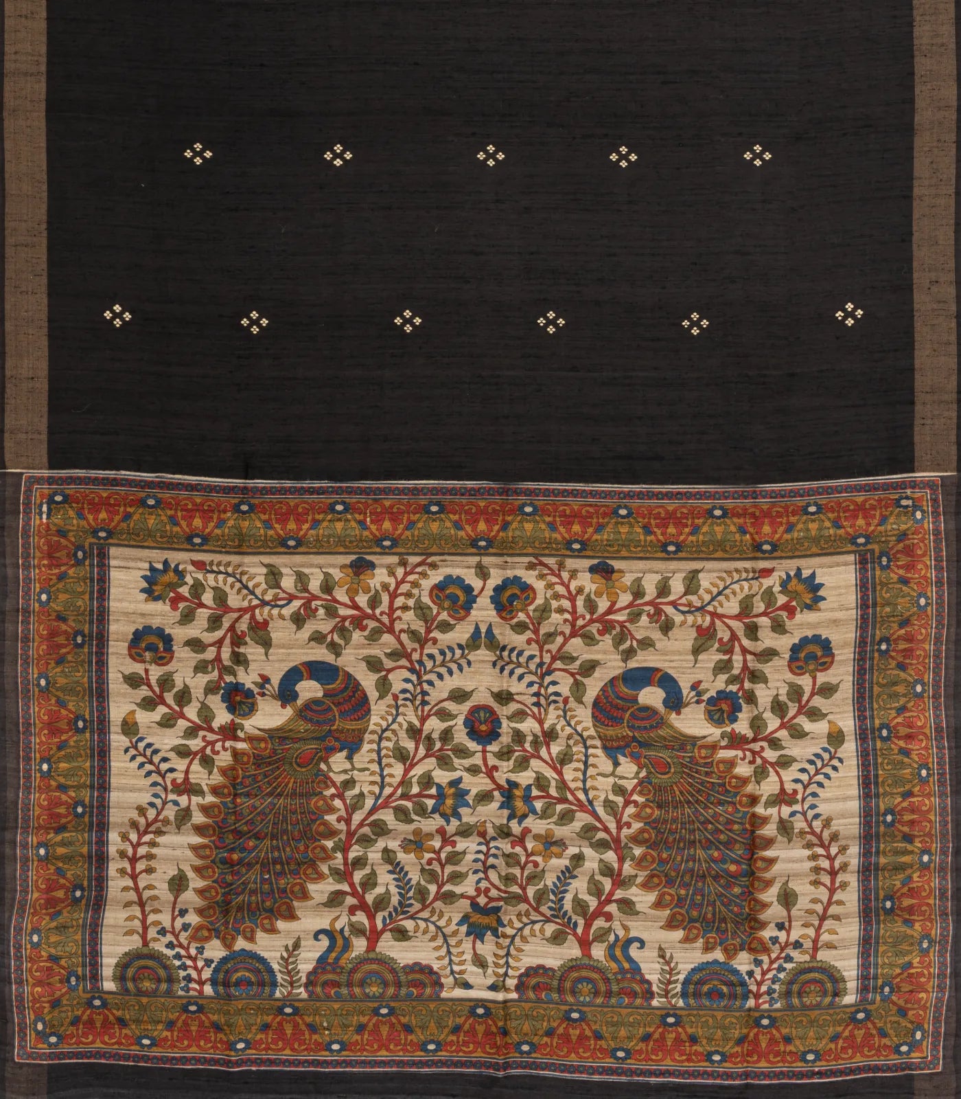 This handwoven dupion silk saree is filled with buttas in black body along with border and printed pallu