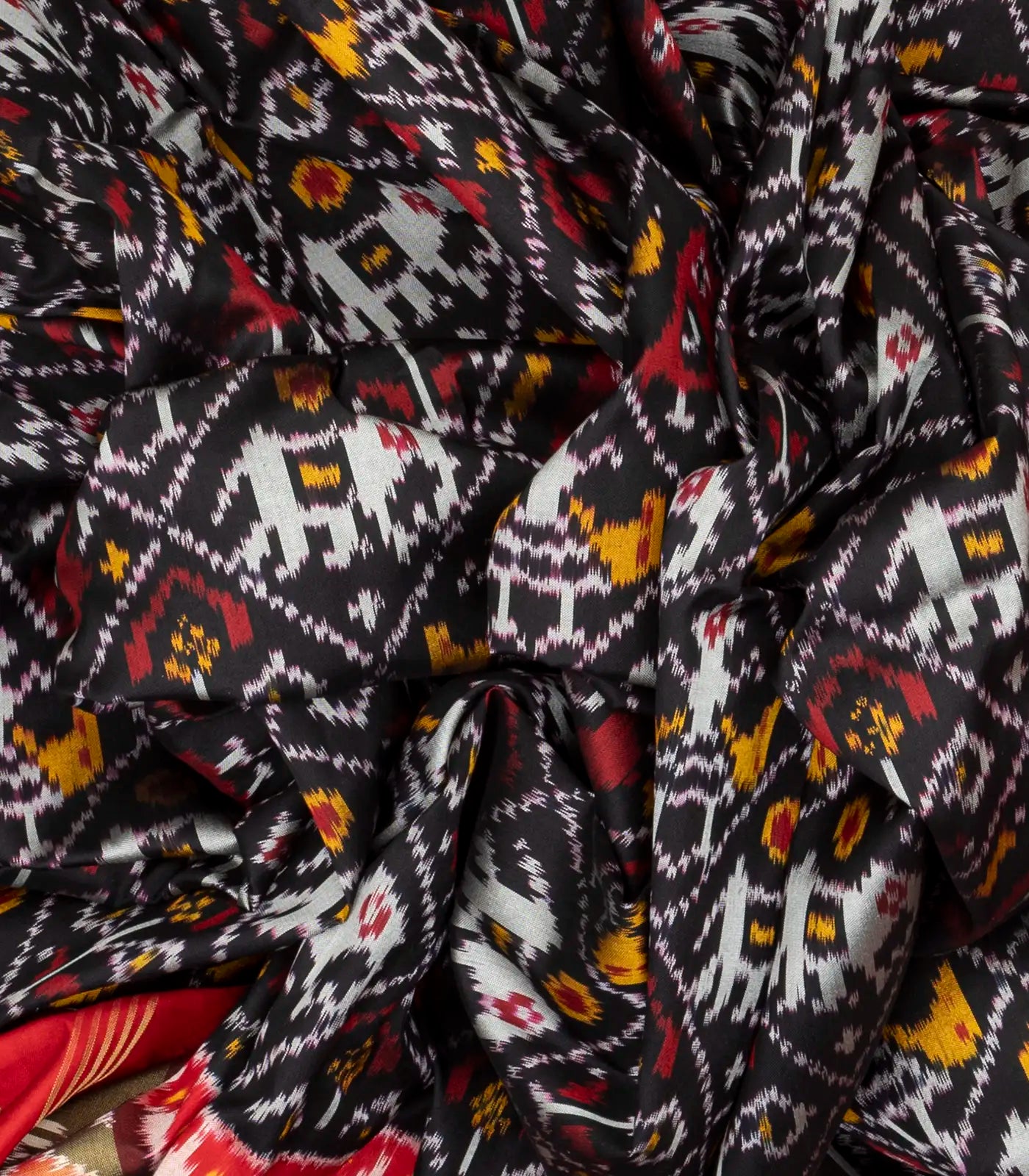 This handwoven single ikat silk saree is filled with elephant motifs in black body along with contrast red border and pallu