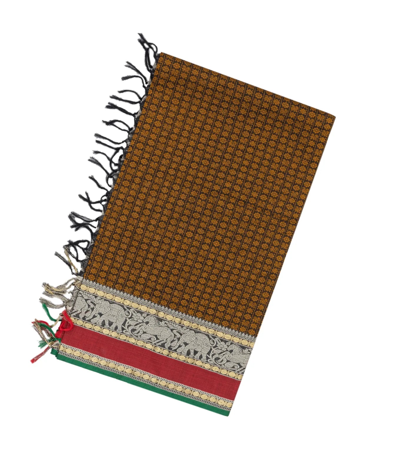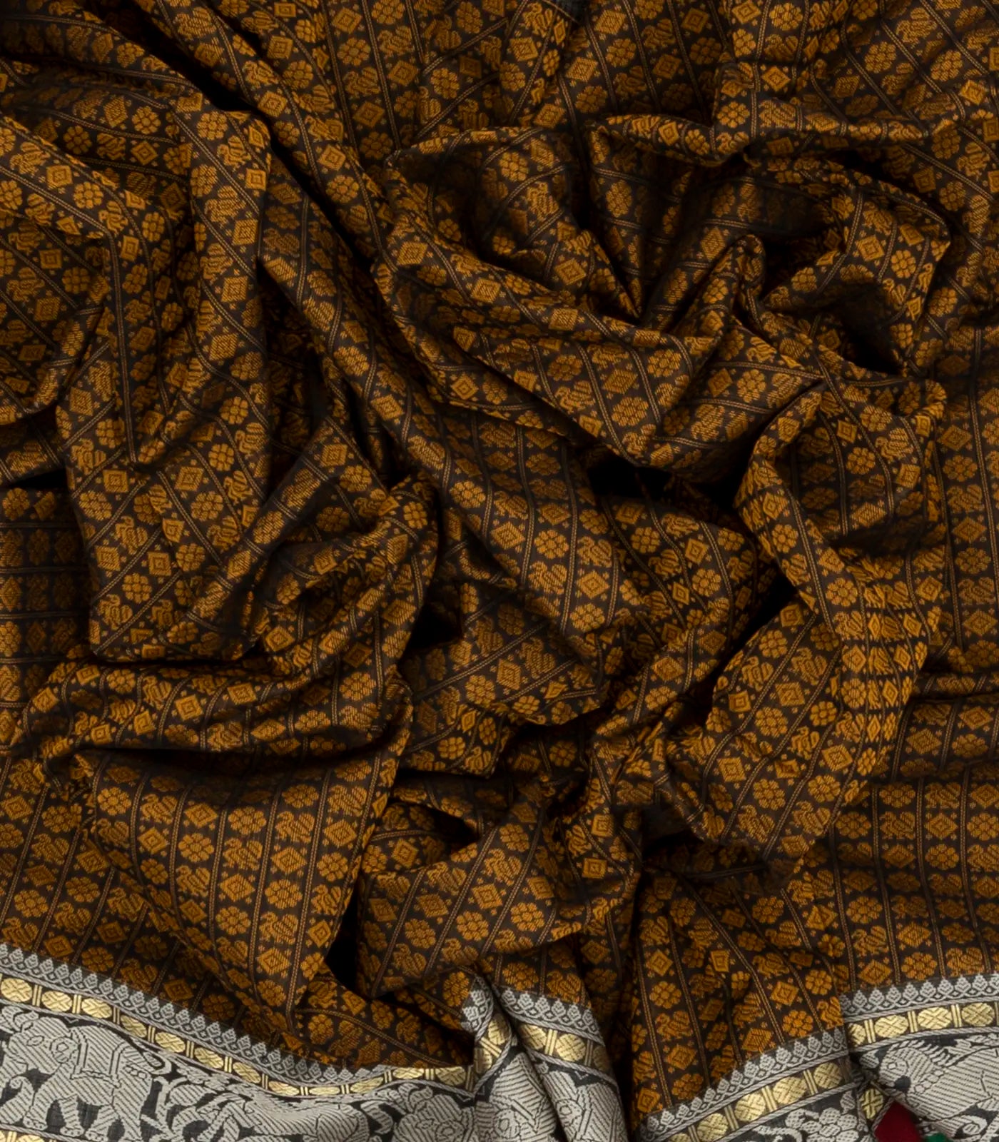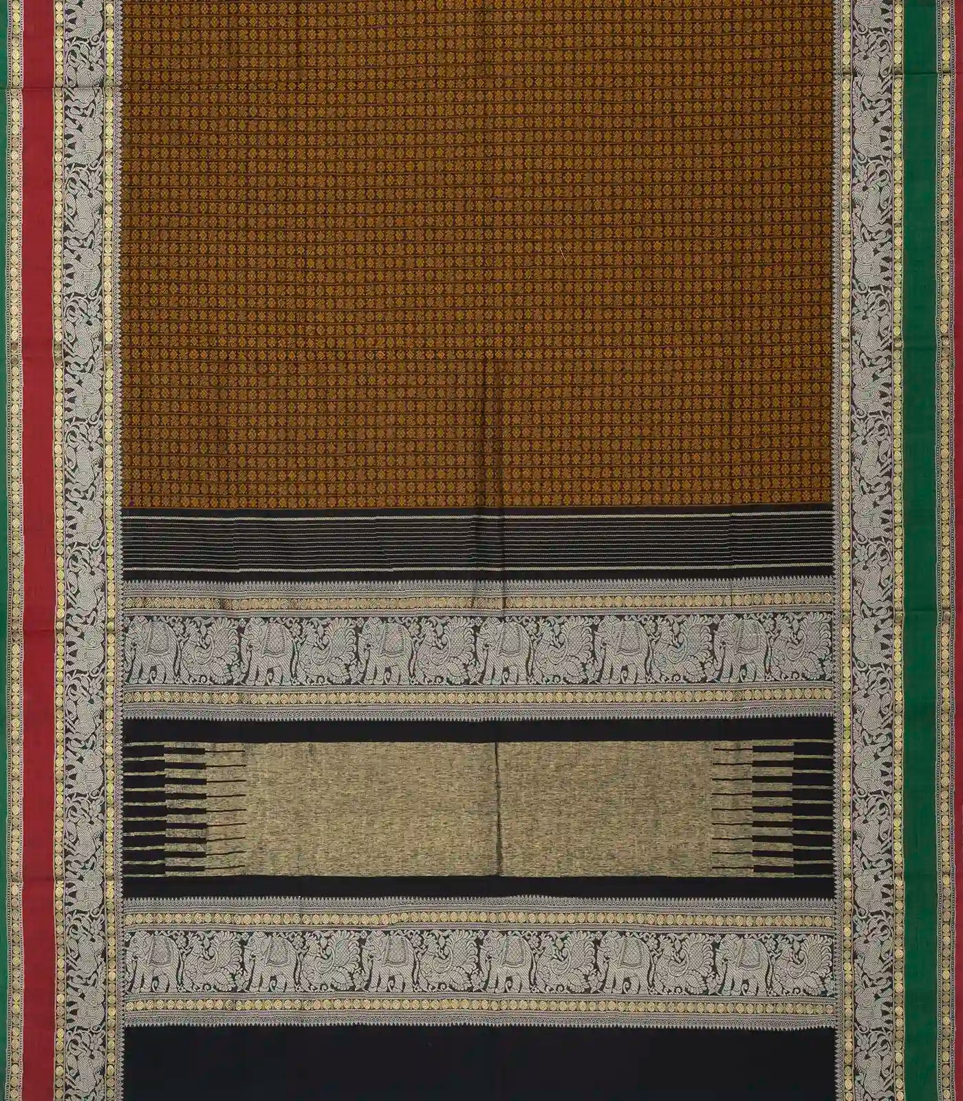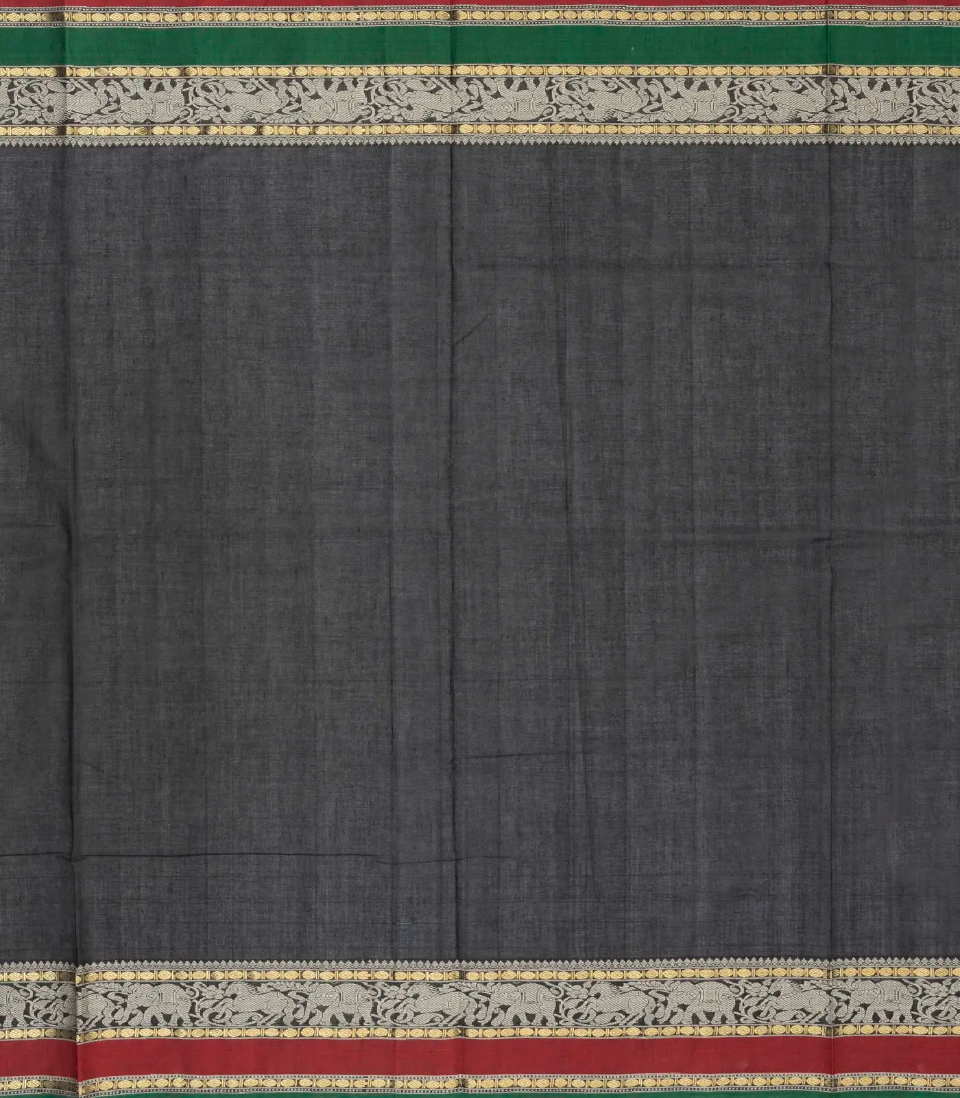 This handwoven kanchi cotton saree is filled with annam chakaram motifs in black body along with contrast border and pallu