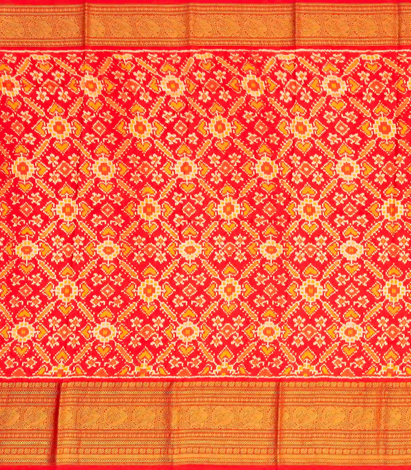 This handwoven kanchipuram korvai silk saree is printed with floral motifs in black body along with contrast red border and pallu