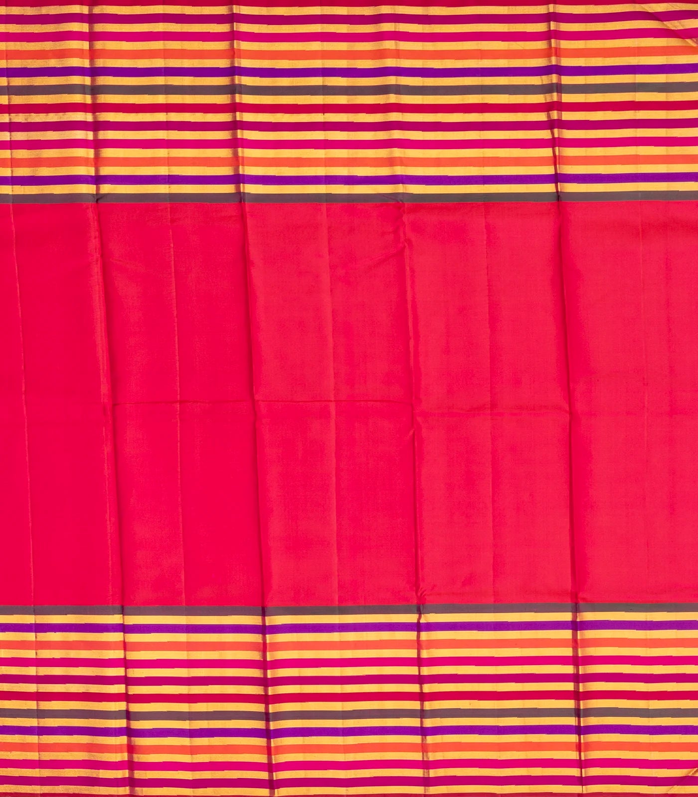 This handwoven kanchipuram silk saree is filled with plain black body along with contrast multi colour stripes in border and pallu