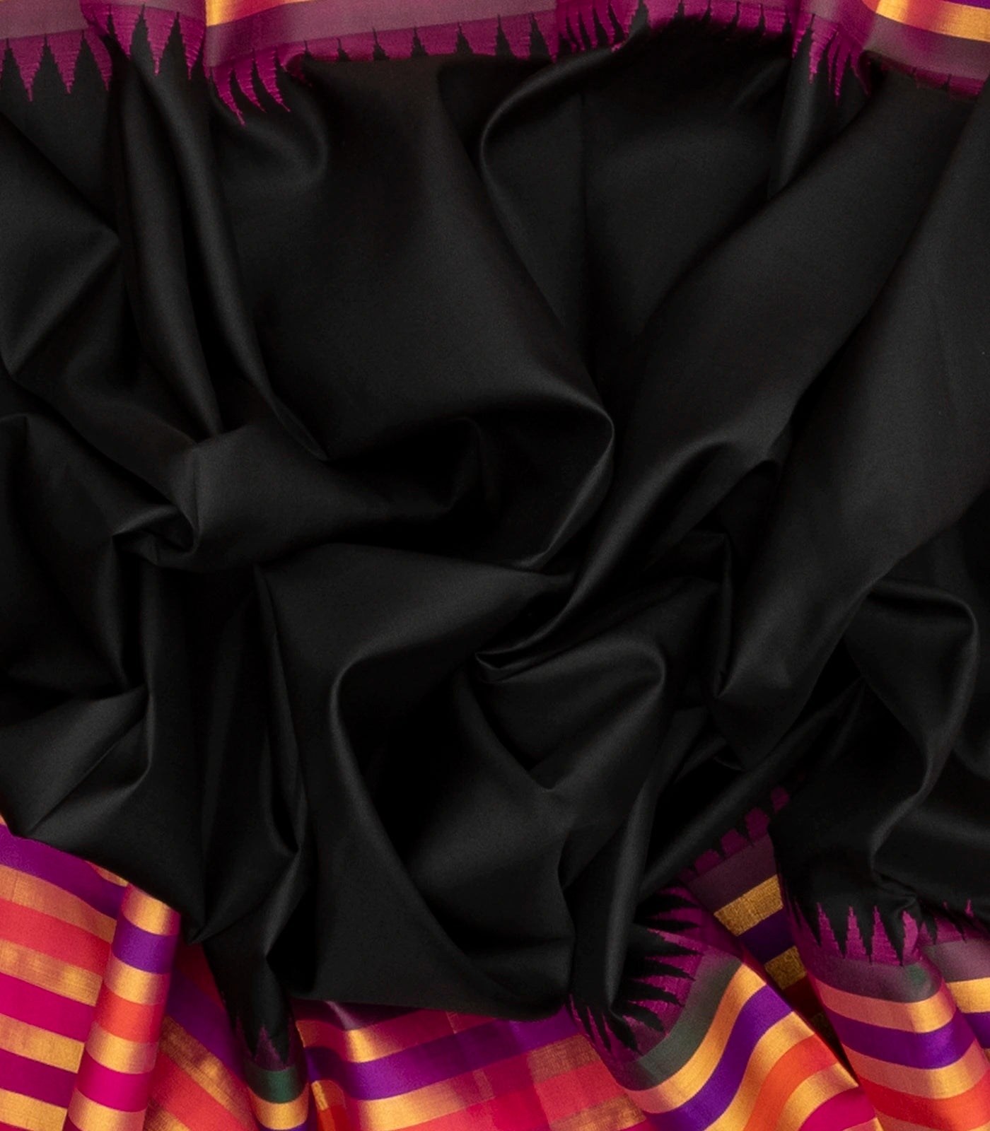 Black Handloom Kanchipuram Korvai Silk Saree With Multi Stripe Border