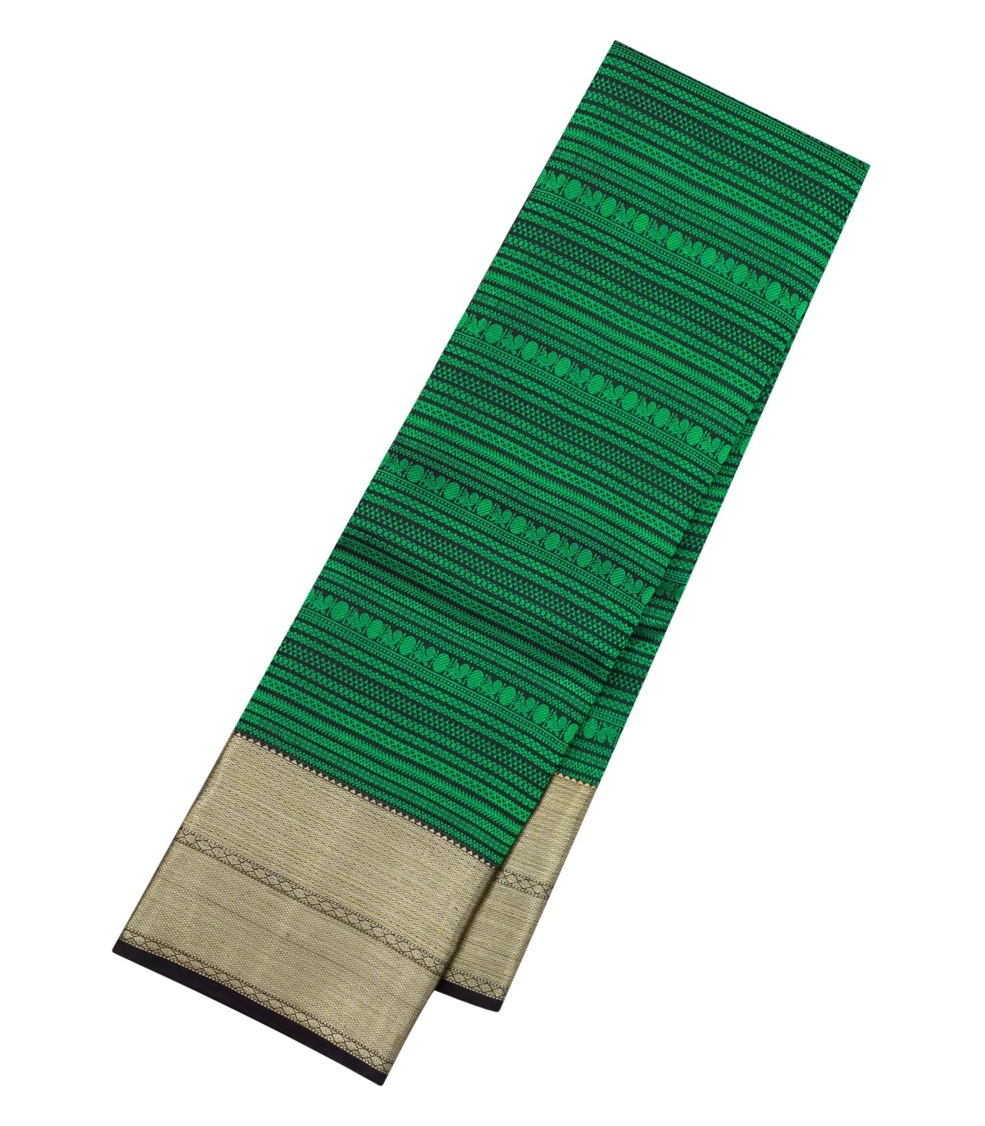 This handwoven kanchipuram silk saree is filled with annam thread work motifs in black body along with zari border and pallu