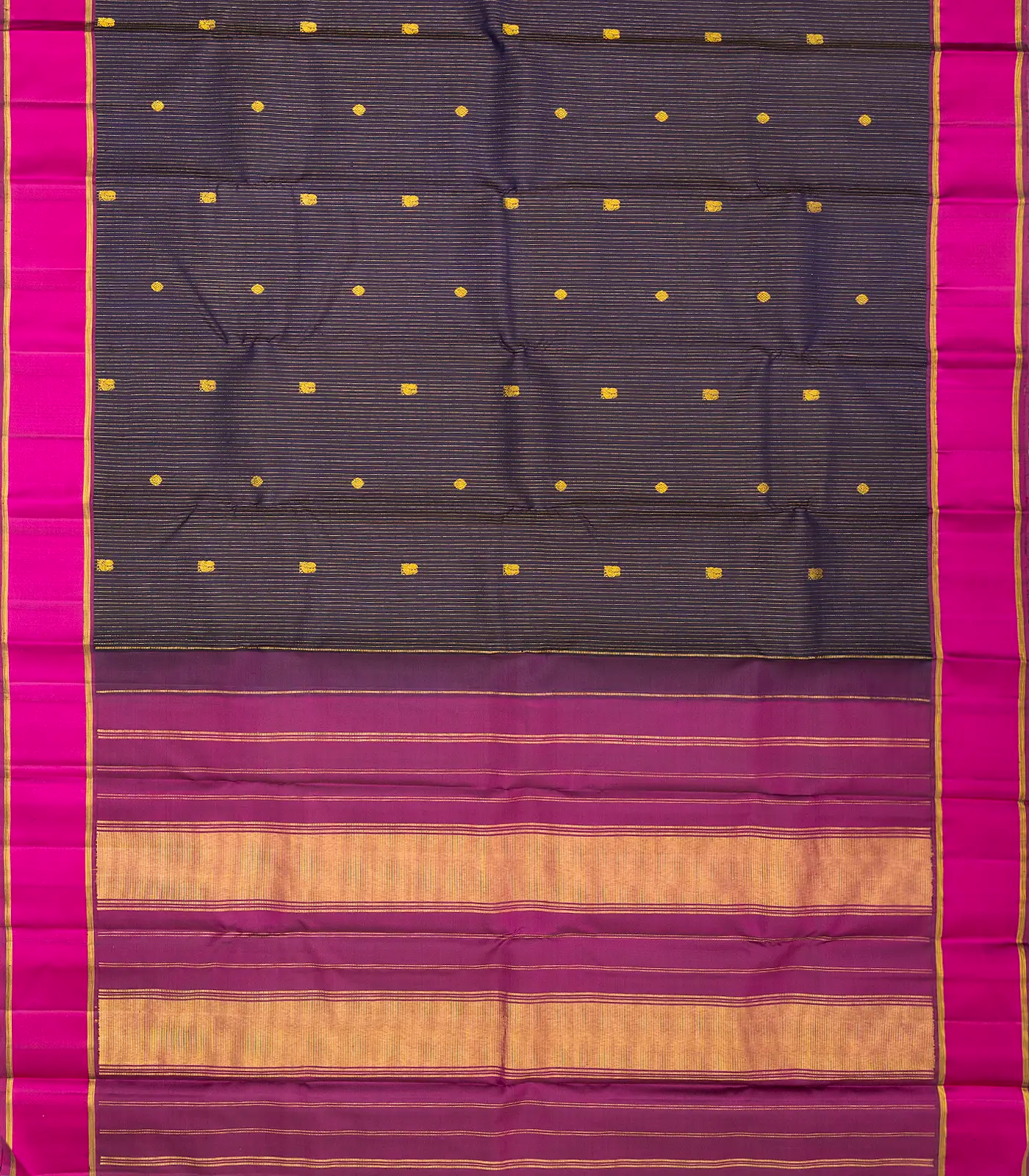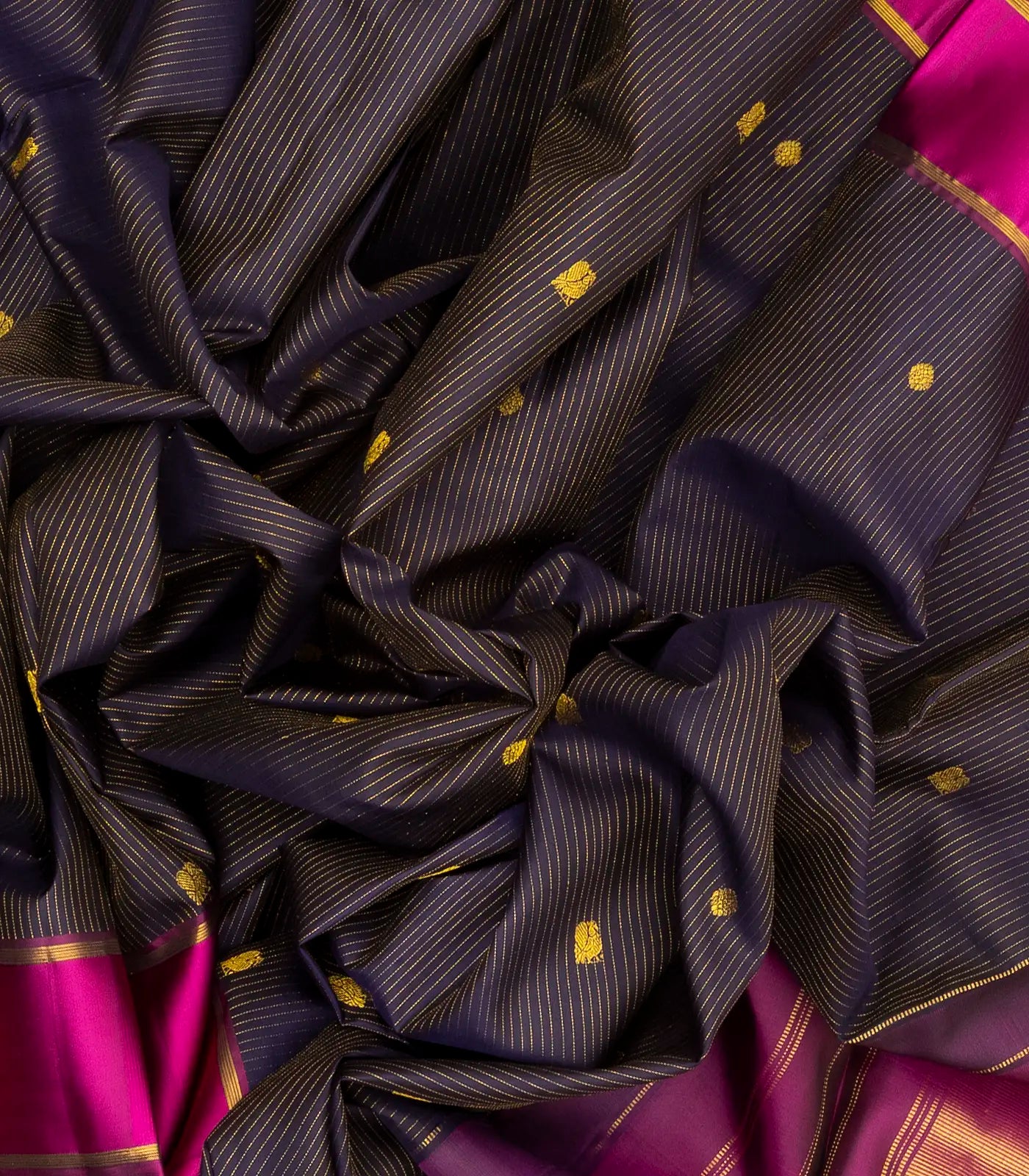 Black Handloom Kanchipuram Silk Saree With Stripes & Buttas