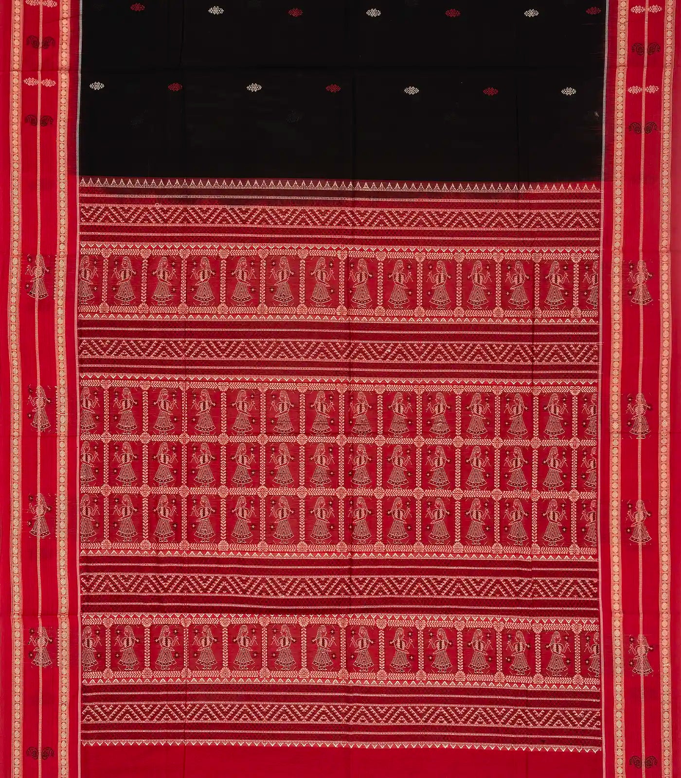 This handwoven Orissa cotton saree is filled with floral motifs in black body along with contrast pink border and pallu