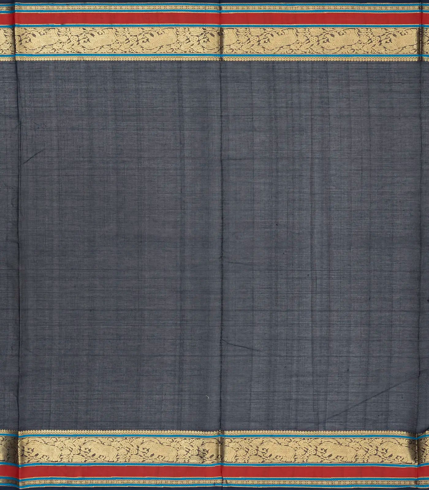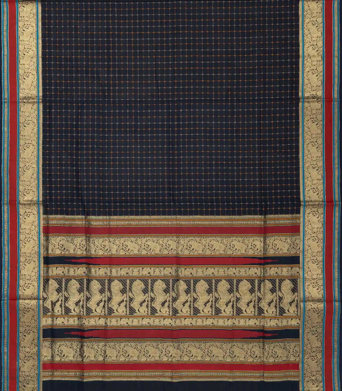 This handwoven silk cotton saree is filled with dotted checks in black body along with elephant motifs in border and pallu