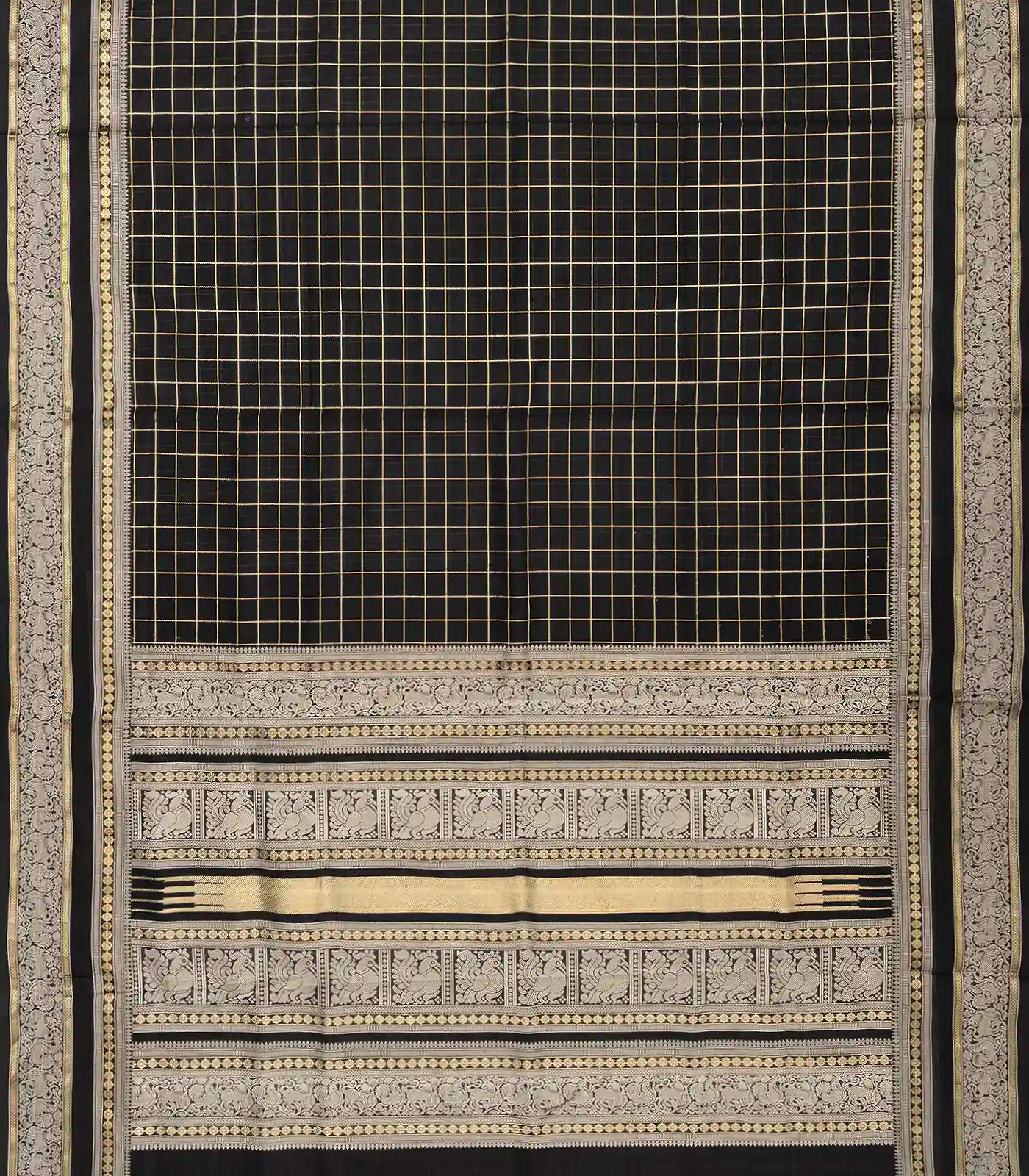 This handwoven silk cotton saree is filled with zari checks in black body along with vanasingaram motifs in border and pallu