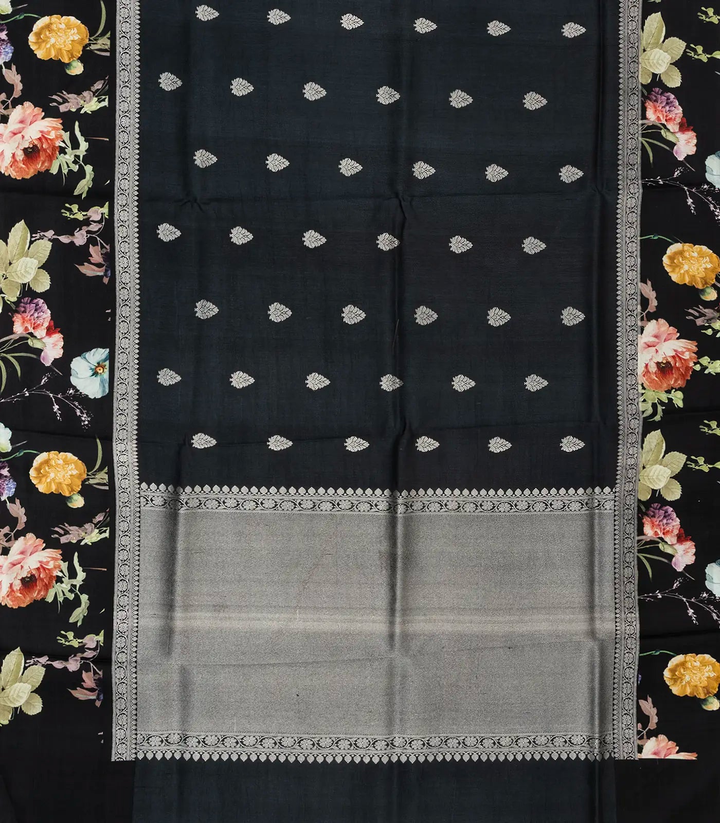 This handwoven tussar silk saree is filled with floral motifs in black body along with printed floral motifs in border and pallu